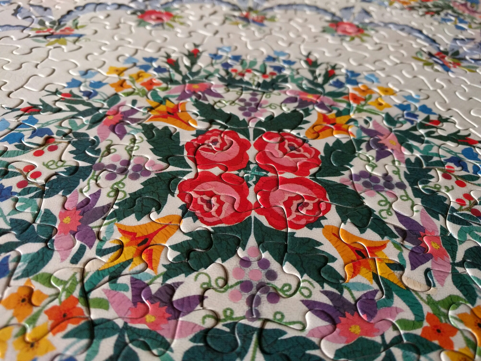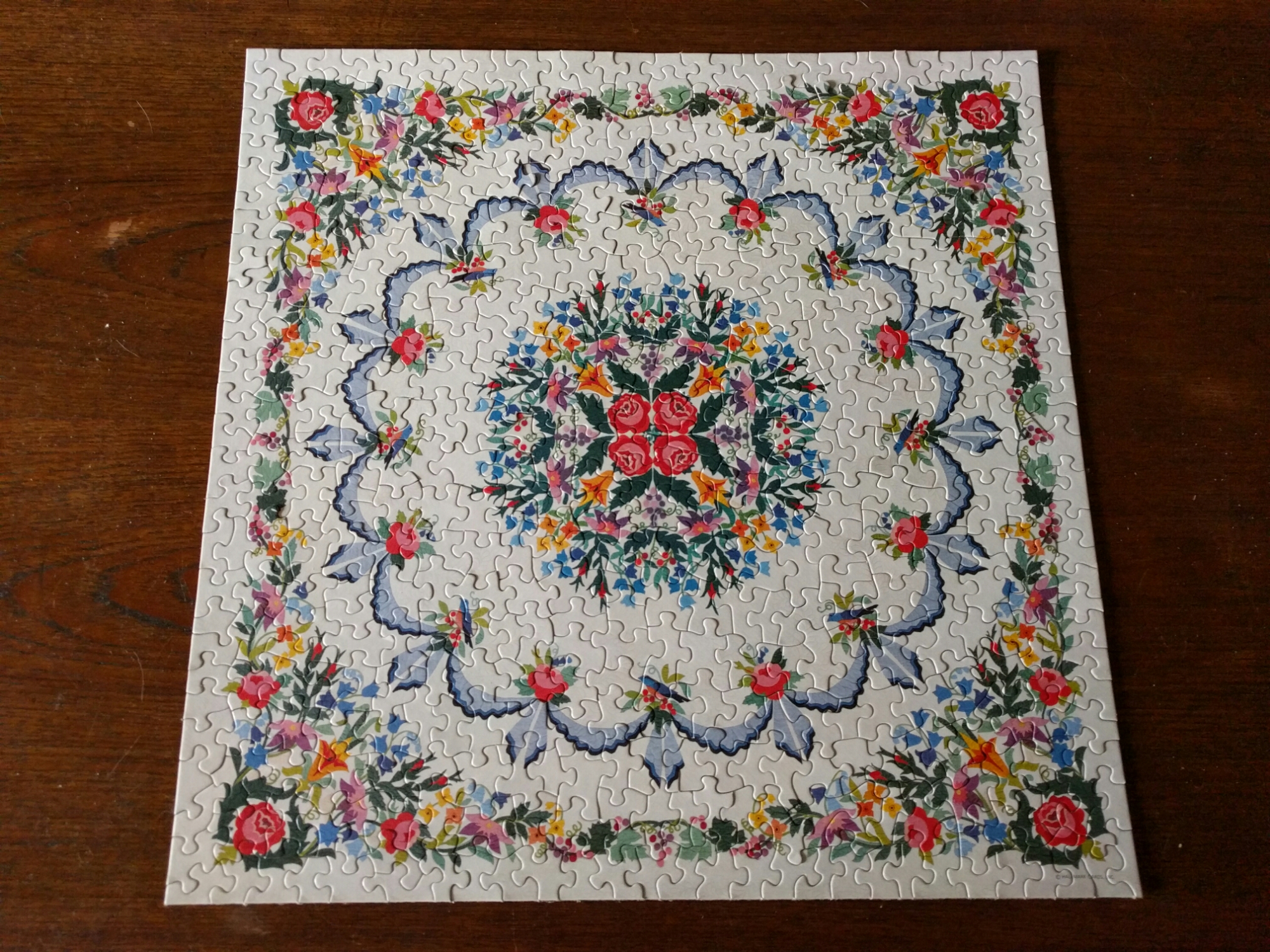 Another Springbok classic, 500 pieces, complete. Found at the M.C.C. Thrift Store in Vancouver. I didn’t realise this but the Paradise Garden Quilt is a real quilt in the Spencer Museum of Arts Collection. A woman named Rose Frances Good Kretsinger made this quilt in 1946 and eventually gave it as a gift to the museum. It is a full sized quilt, I tried to photograph some of the detail in the puzzle but I encourage interested readers to Google the quilt.