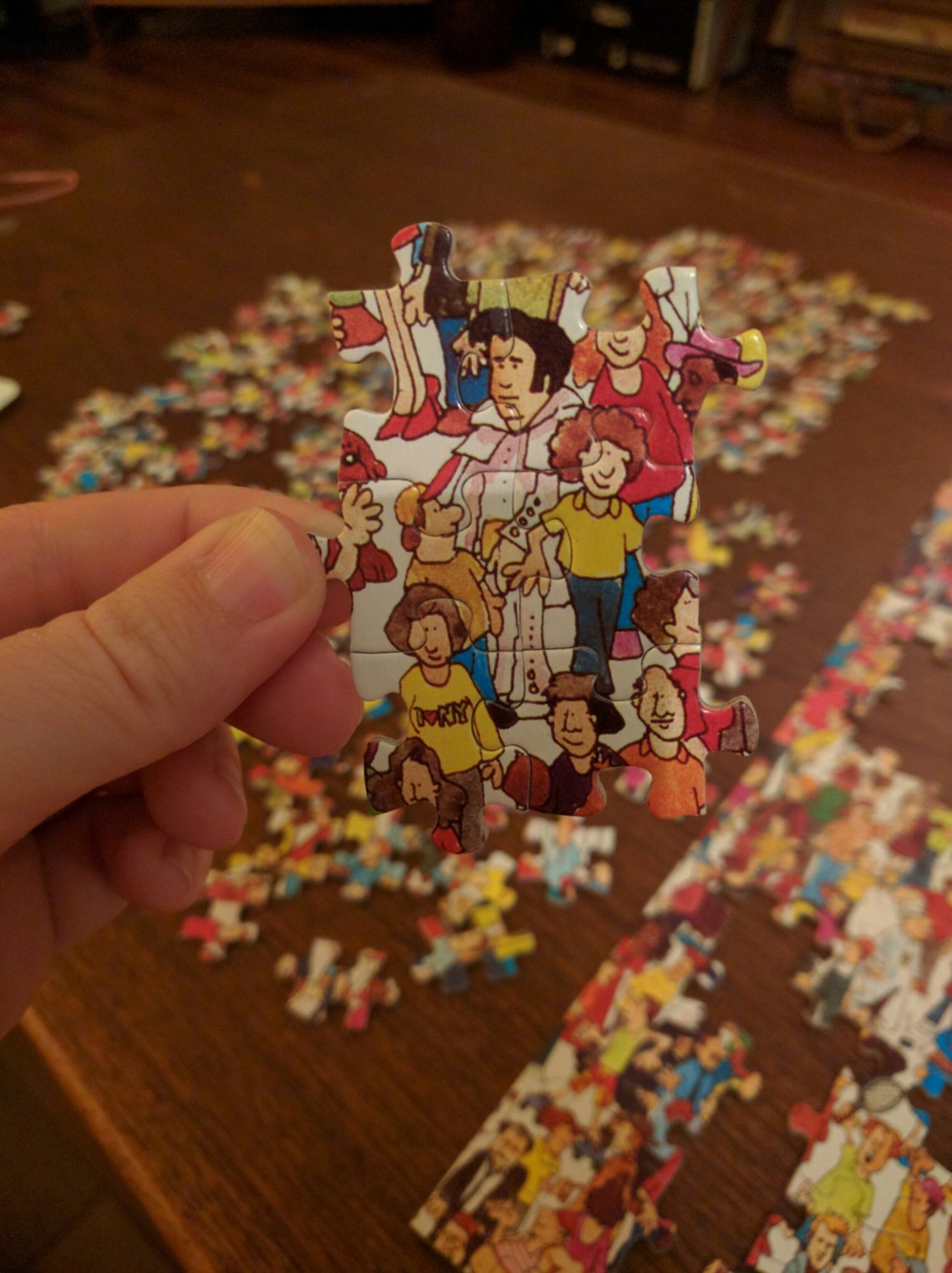 A Buffalo Games puzzle from 1993. This puzzle comes complete with Elvis and some more famous people. So far I’ve found Madonna, Andy Warhol, Abraham Lincoln, Tarzan and Jane, Scooby Doo, Charles and Diana, the three bears, Superman, Jessica Rabbit, Mikhail Gorbachev, The Lone Ranger and Tanto, Julie Andrews, Charlie Chaplin, John Wayne and I think Weird Al.
