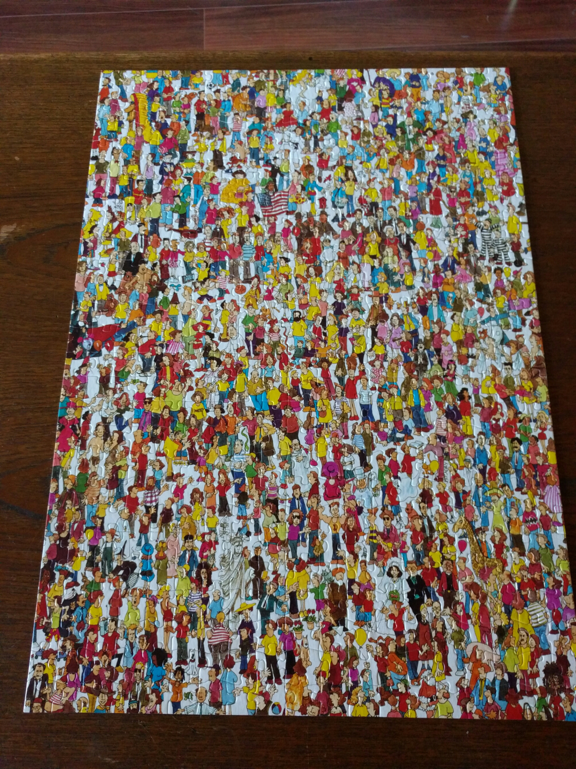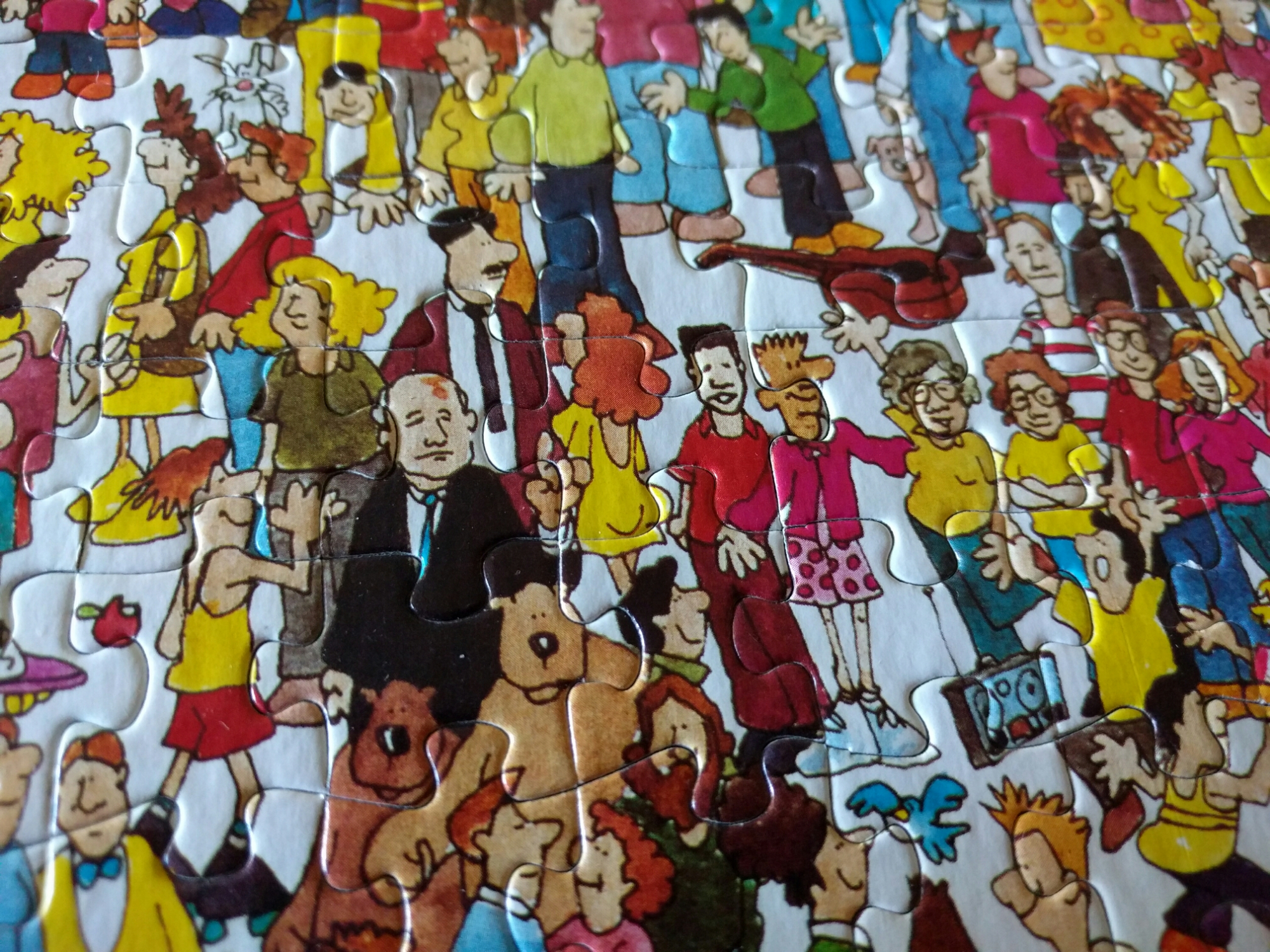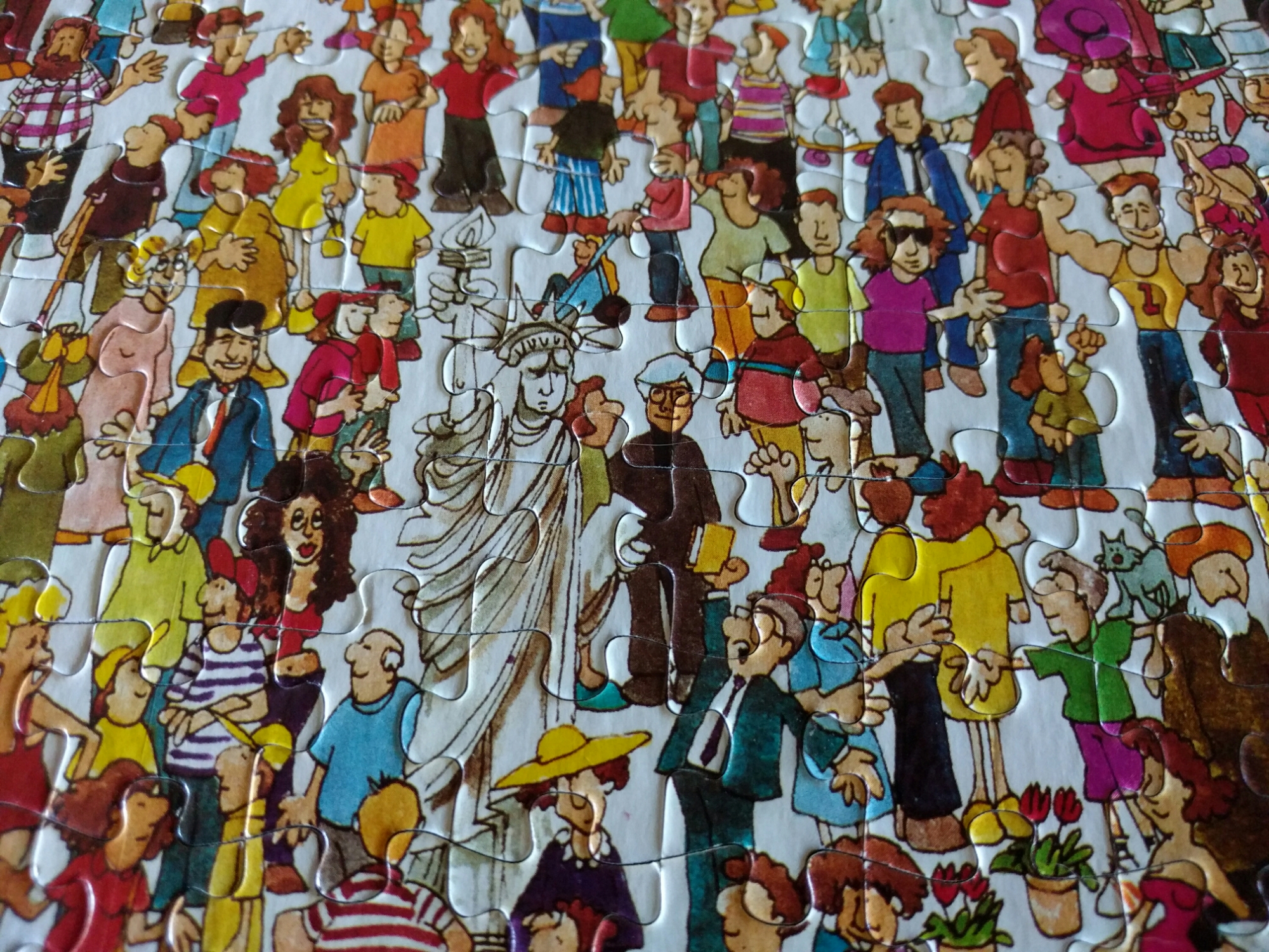 A Buffalo Games puzzle from 1993. This puzzle comes complete with Elvis and some more famous people. So far I’ve found Madonna, Andy Warhol, Abraham Lincoln, Tarzan and Jane, Scooby Doo, Charles and Diana, the three bears, Superman, Jessica Rabbit, Mikhail Gorbachev, The Lone Ranger and Tanto, Julie Andrews, Charlie Chaplin, John Wayne and I think Weird Al.