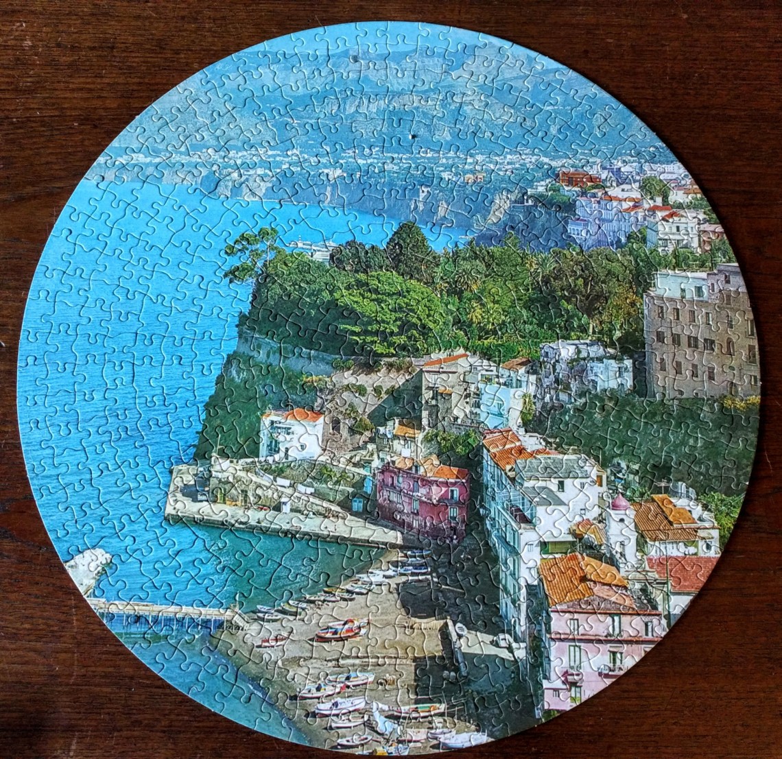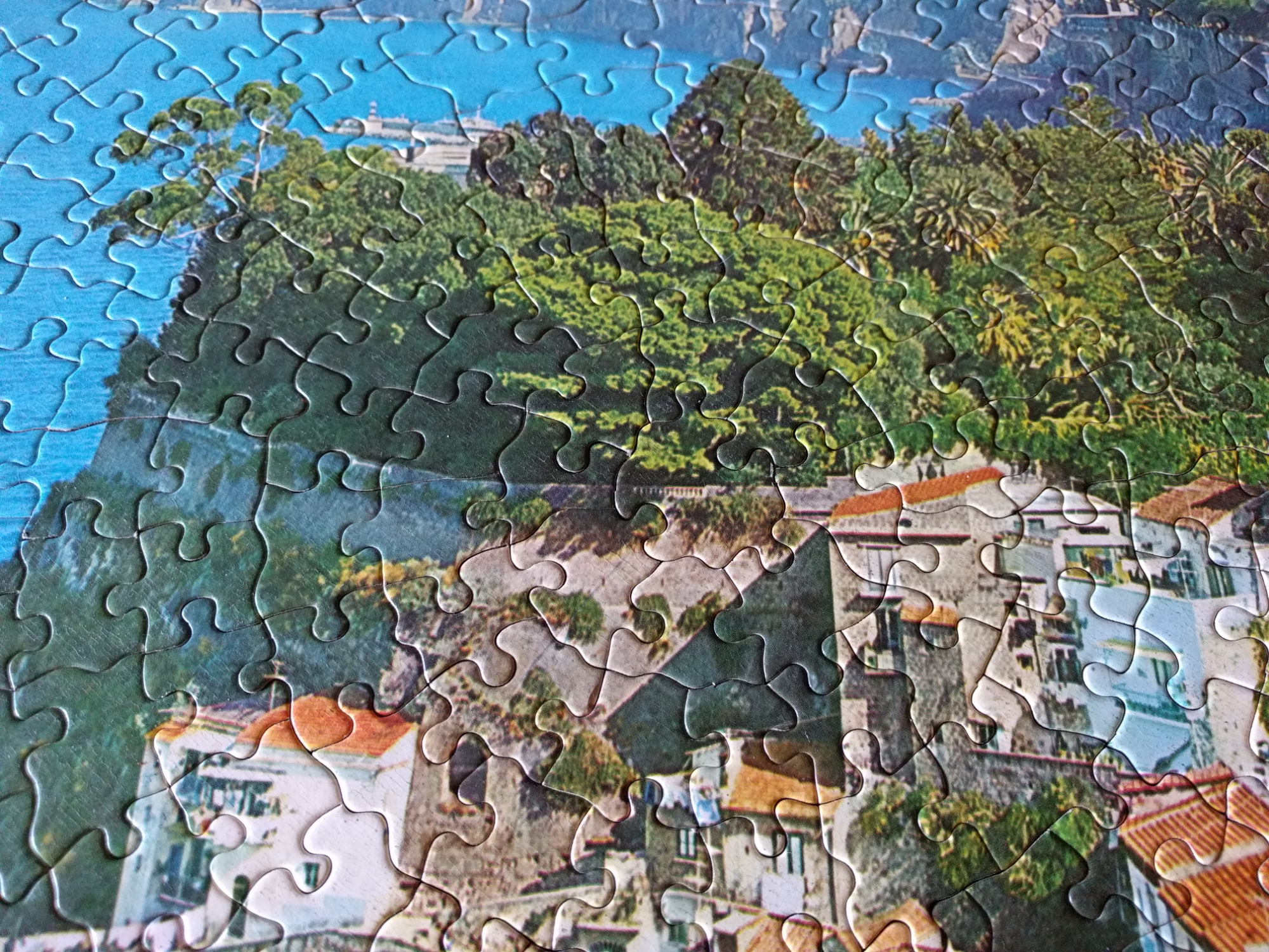 Another vintage Milton Bradley puzzle, this one manufactured in 1968 from a series entitled Dorset Round Puzzles. This particular one shows a peaceful scene along the Mediterranean Coast, as I was putting it together I was remembering scenes from James Bond movies and Alfred Hitchcock’s To catch a Thief.