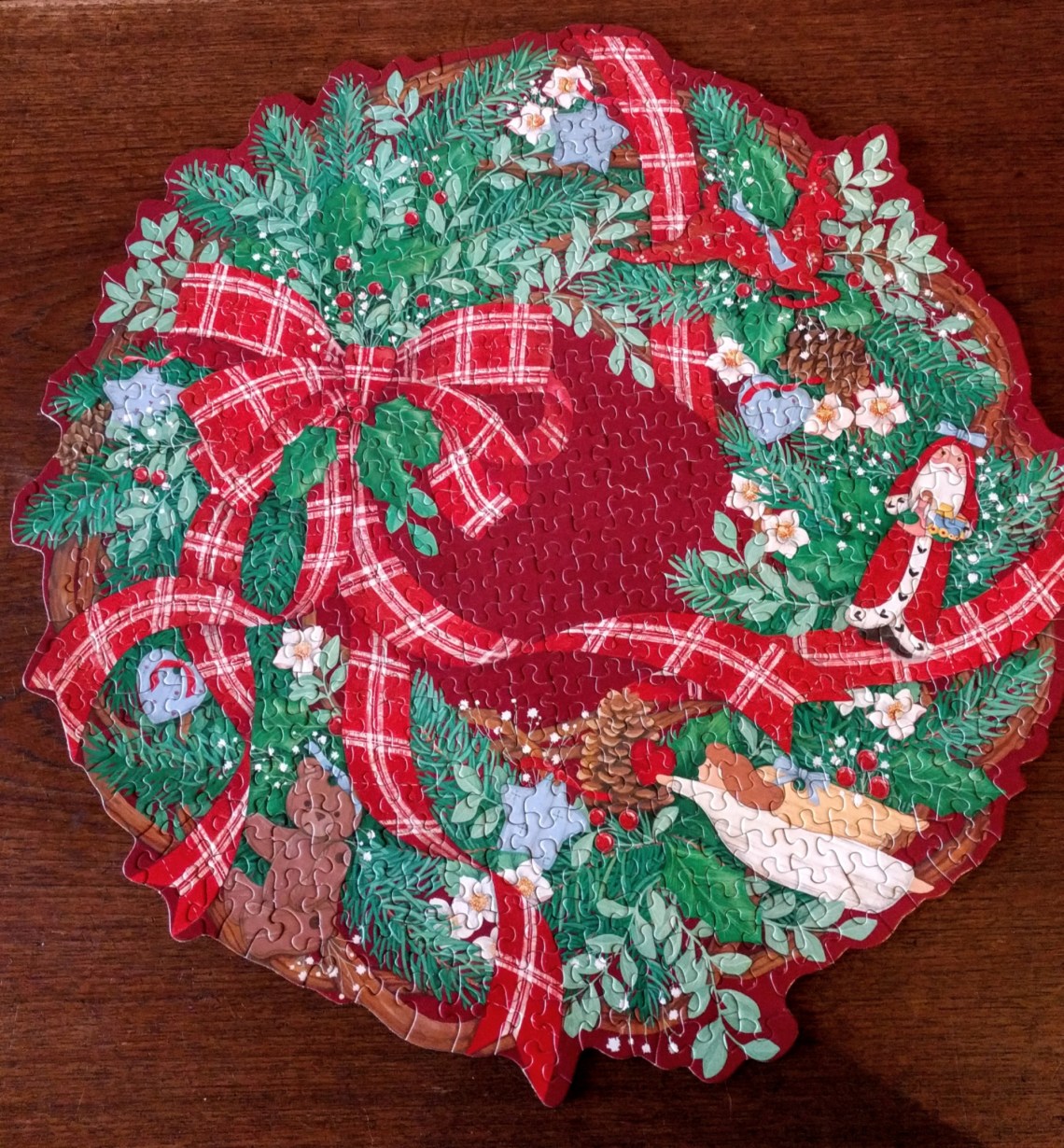 A wreath shaped puzzle?! Christmas edition puzzles are very popular, what puzzle lover wouldn’t love a reason to do a puzzle on their winter break? Springbok has the festive puzzles mastered, I have to say though, this is by far the best one I’ve found yet. I found it in a Salvation Army Thrift Store in early fall and have waited two Christmas’s to put it together. Last year was just a bit too hectic and I hadn’t found the time, but this year I made sure to set aside some time.