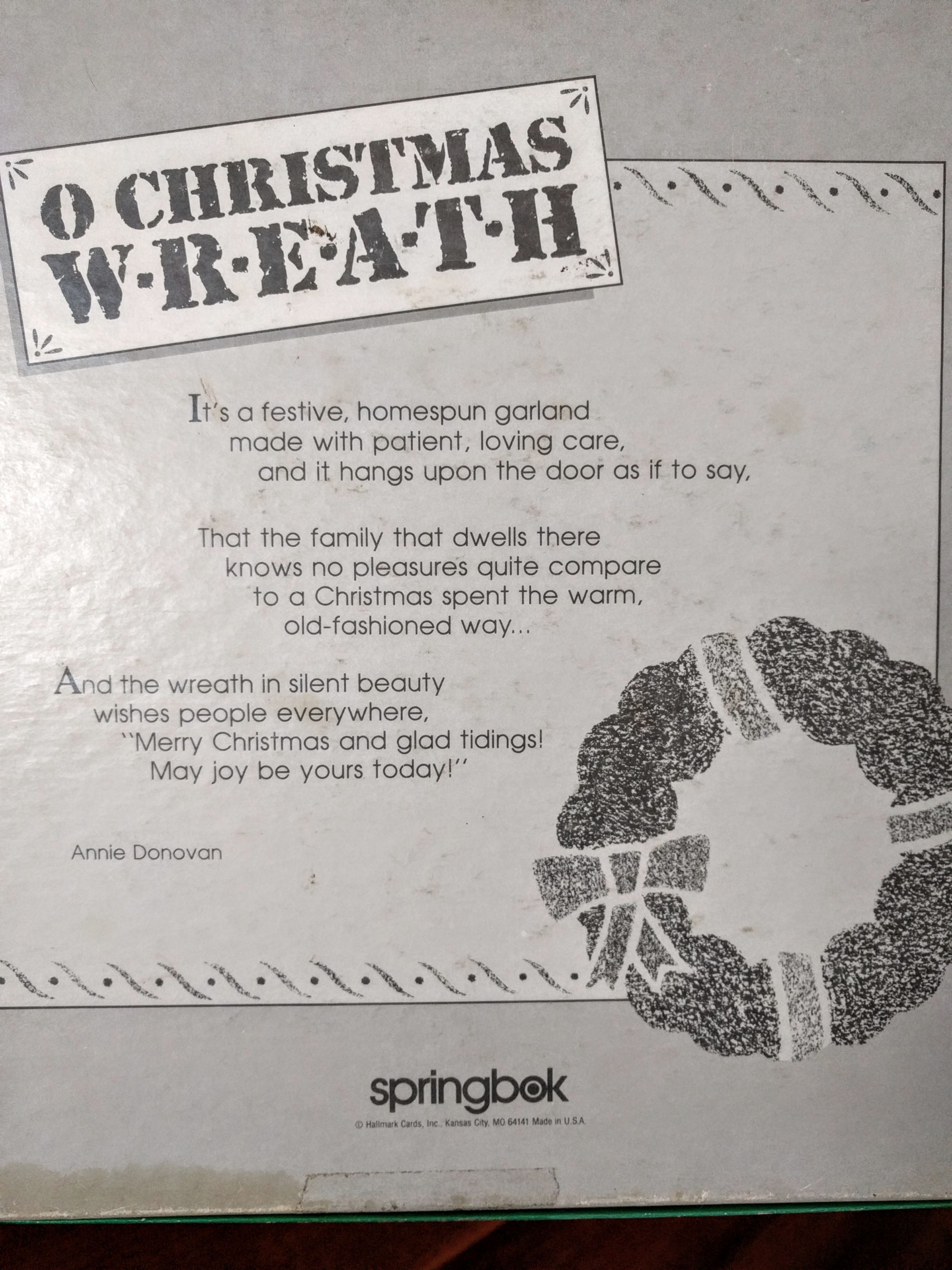 A few things I find very interesting about this puzzle; obviously, the wreath shape cut, how cool is that?! The poem on the back of the box, the font of the title is a bizarre choice for a festive puzzle, looks more like a dog tag or GI Joe font.