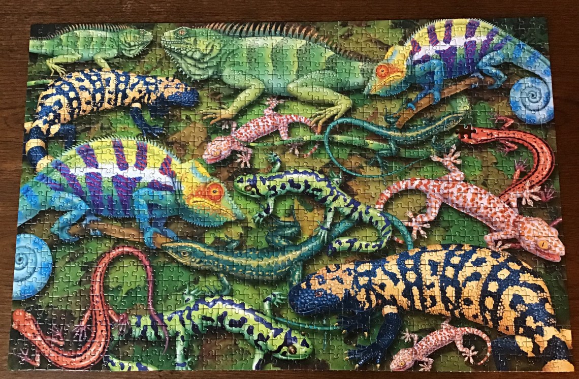 A Piatnik puzzle out of Austria, manufactured in 2000, a collection of different salamanders. I chose this puzzle because of all the fabulous colours, the puzzle had strong pieces and very nice vibrant colours, but I found it to be a very loose fit.