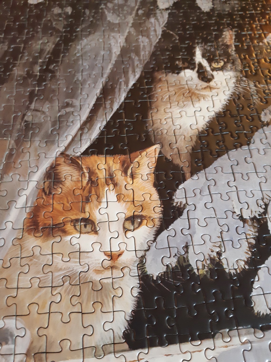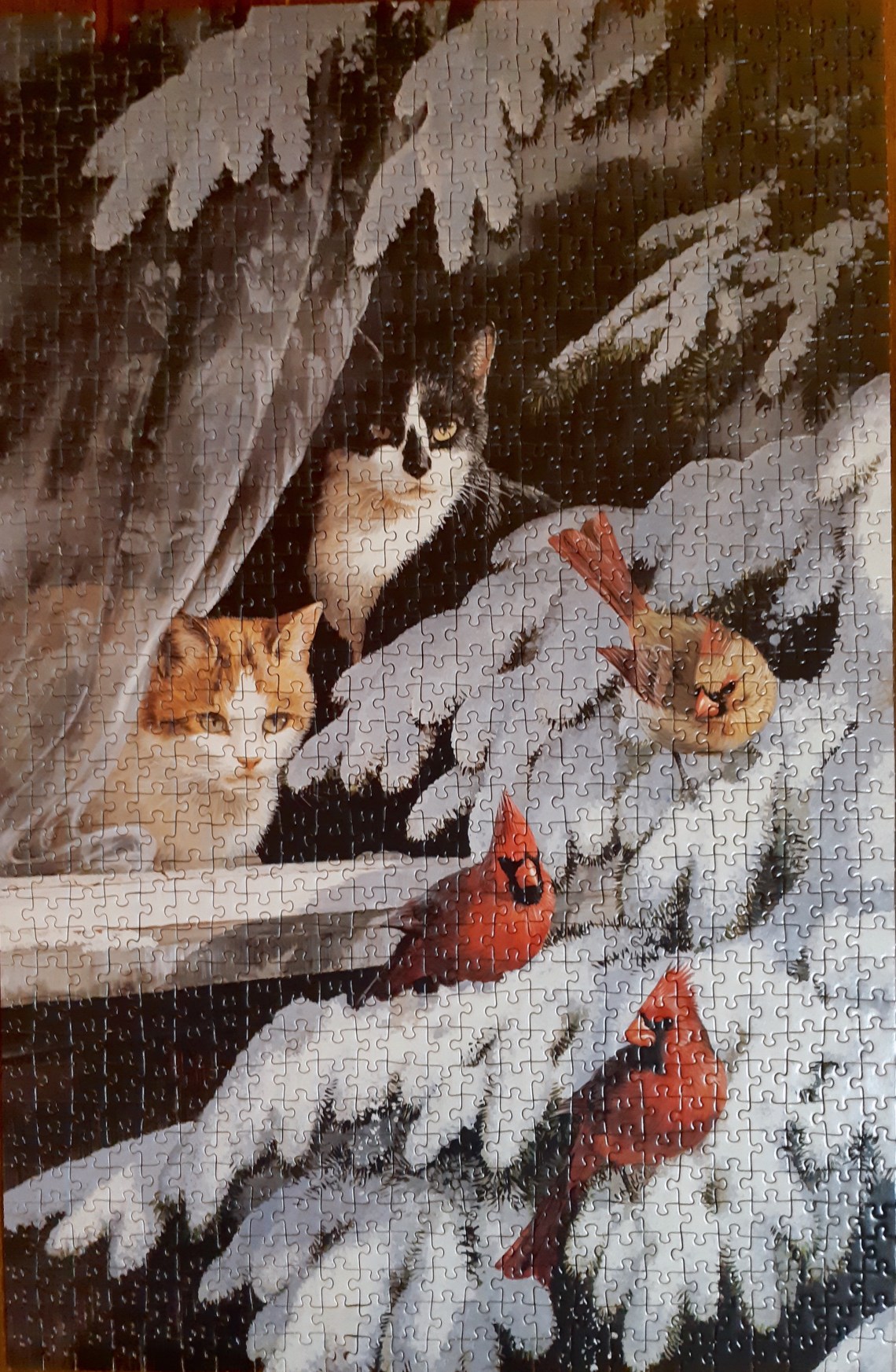 A wonderful find in a thrift store in New Westminster, BC. A friend of mine treated me to a little thrifting excursion, after which, we enjoyed a delicious little Ukrainian feast. This 1000 piece puzzle by FX Schmidt manufactured in 1993 was one of my finds that day. This is the ultimate kitty puzzle, watching birds from the warm comfort of their home! Sadly, one piece missing. Here’s a photo of the finished image plus close ups of our furry and feathered friends.