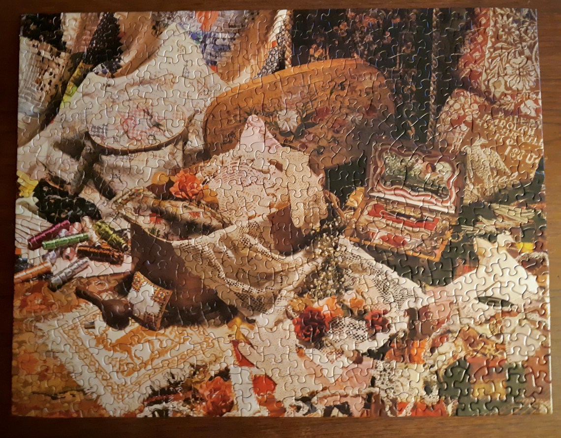 This is a 500 piece puzzle, complete and if I were to guess, this dates back to the eighties. A delightful collection of doilies, embroidery and notions. Absolutely charming.