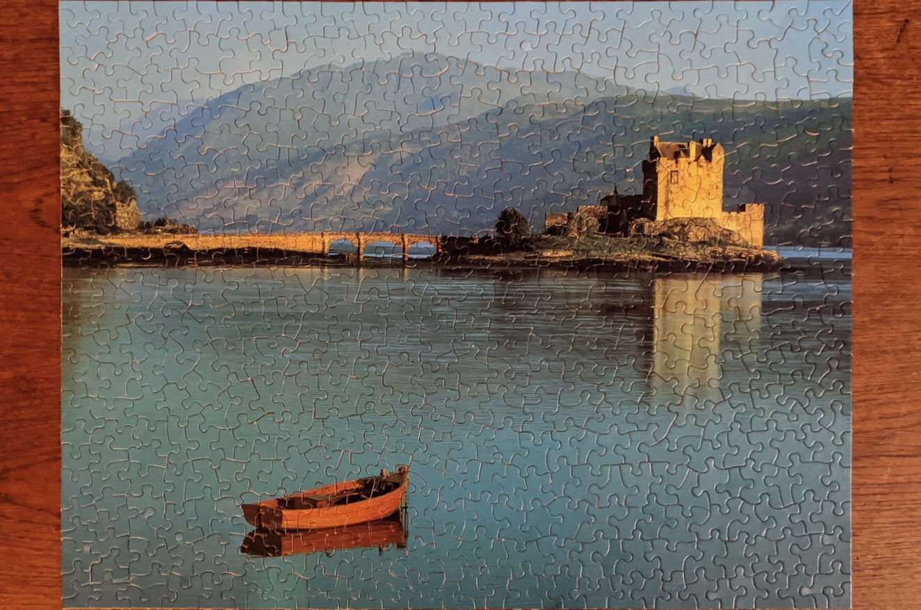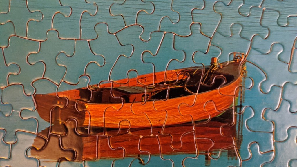 I’ve owned this beautiful Springbok puzzle for at least ten years now. Gorgeous colours, peaceful scene and lonely rowboat. You may be wondering, do I move my puzzles around? Depends…. sometimes a move is a good push for me to reassess the need for these puzzles, pushing me to keep the really nice ones only. This one has moved twice! Will it move a third? We shall see.