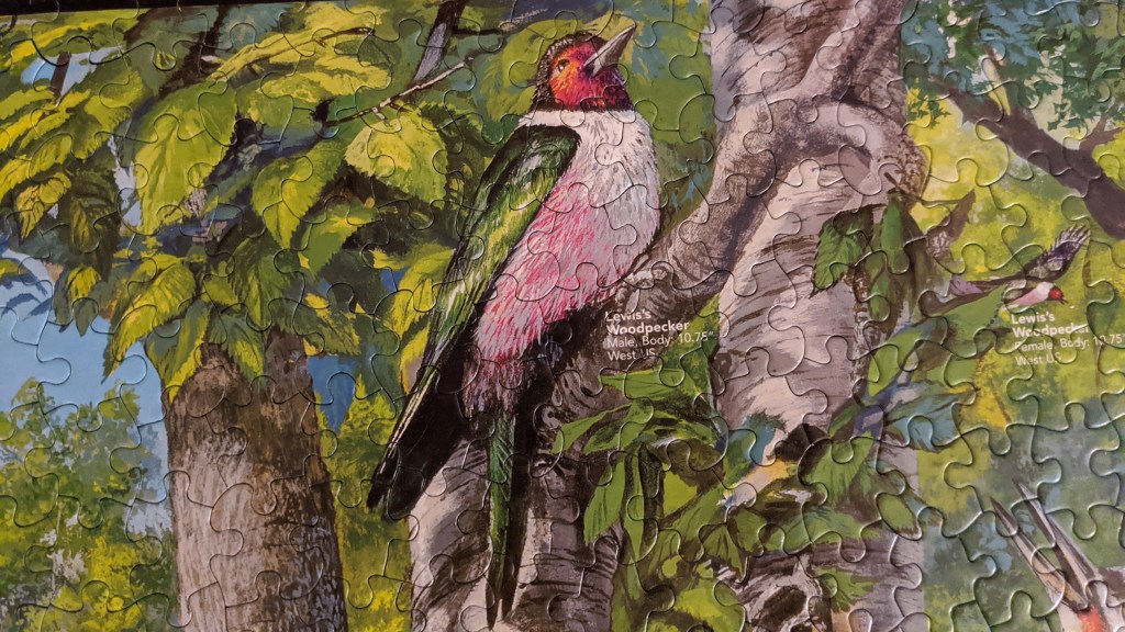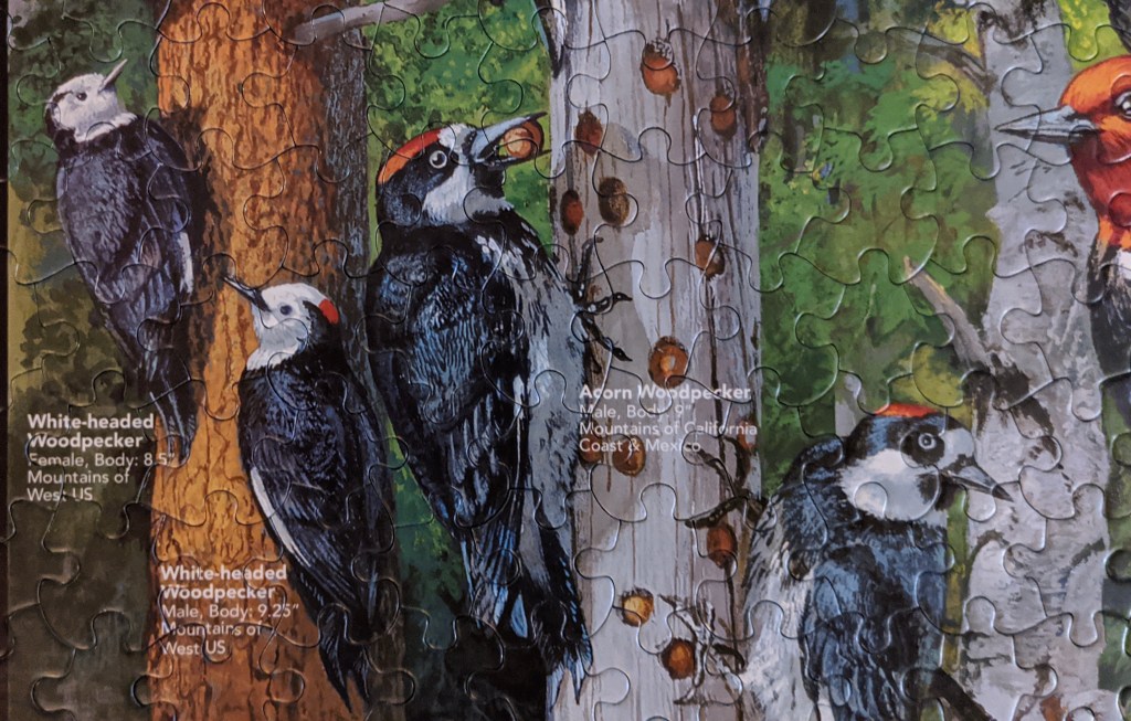 This is a puzzle manufactured in 2010 by White Mountain Puzzles. It was a good one, solid fit and strong vibrant pieces. Please enjoy my favourite woodpeckers below.