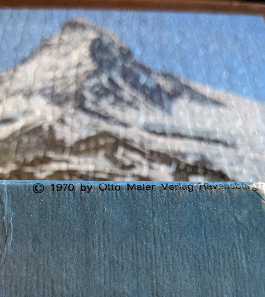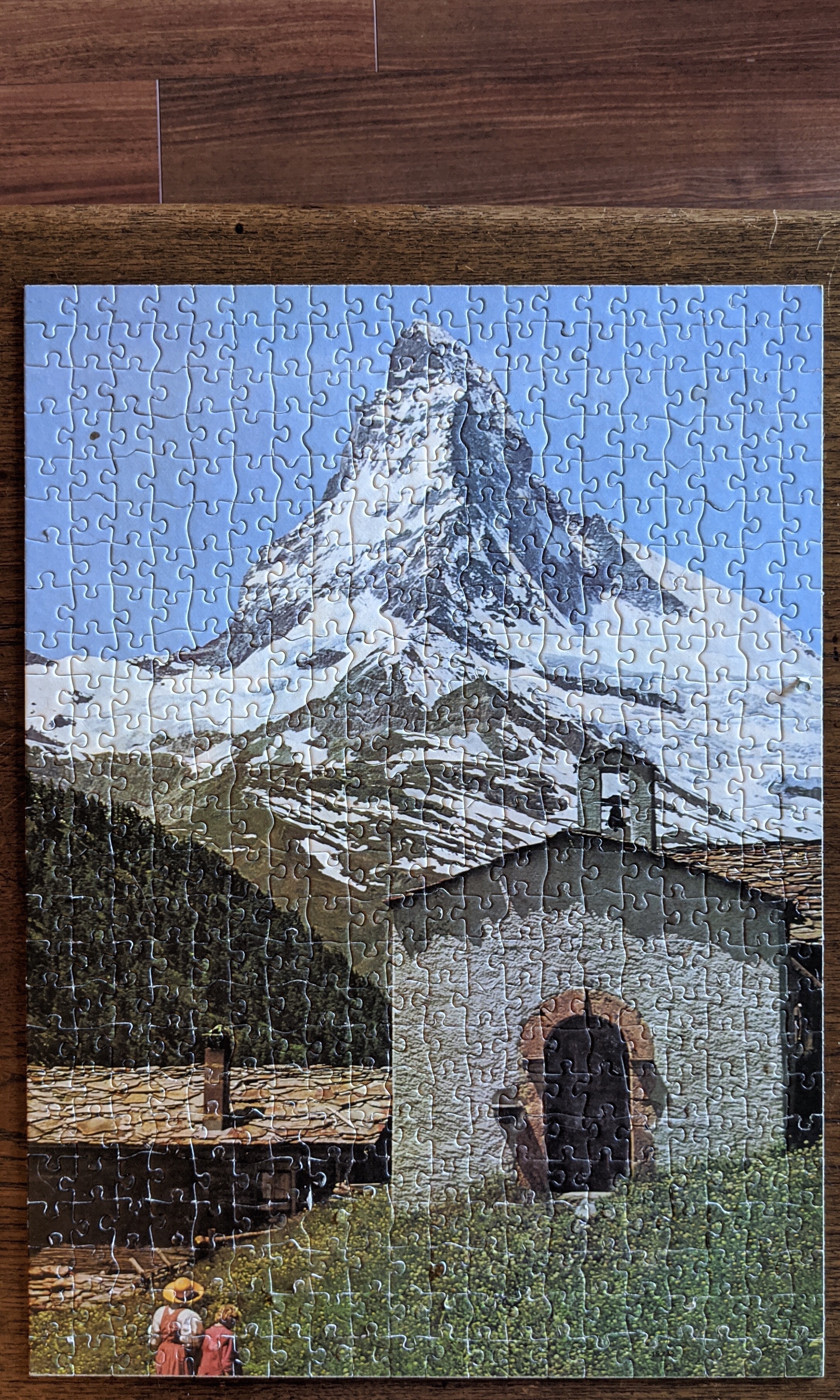 A vintage 500 piece Ravensburger puzzle from 1970, this one is 50 years old! Part of the country series, this scene is certainly idyllic, a lovely little cottage, blue skies, Landfrauen, and the majestic Matterhorn in the distance.