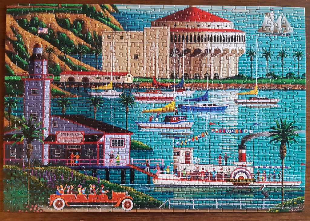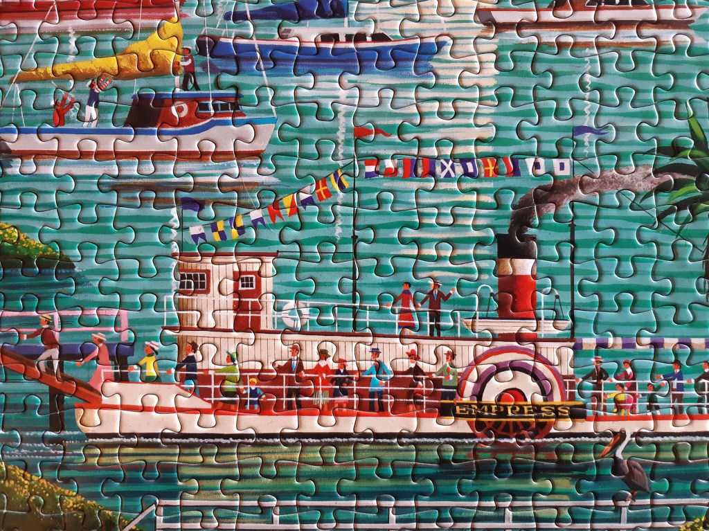 A cute little 500 piece puzzle released by TCG Toys and Sure-Lox that I picked up at Value Village last week. This was such a fun puzzle to put together because it’s just so colourful and varied. There is also a little cat hidden in the image. He’s standing on the lookout tower of the purple building. Maybe he was fishing?