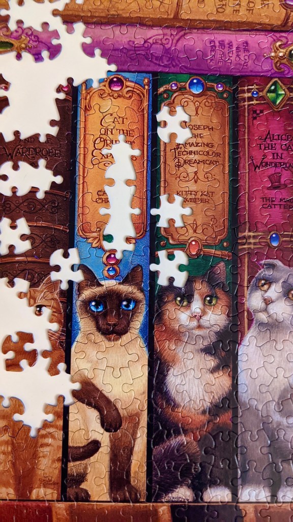 As a friend of the cats, I was pretty happy to find this puzzle at my local Value Village. A brand that I hadn’t tried before and cats all over! The brand is called the Vermont Christmas Company, made in the USA too.