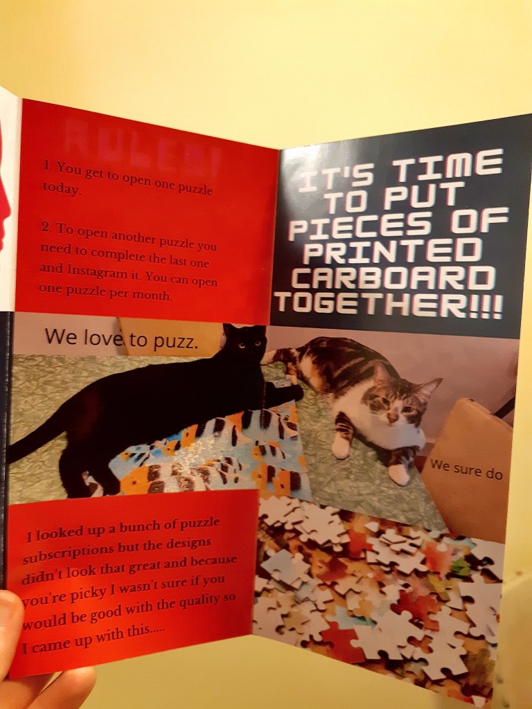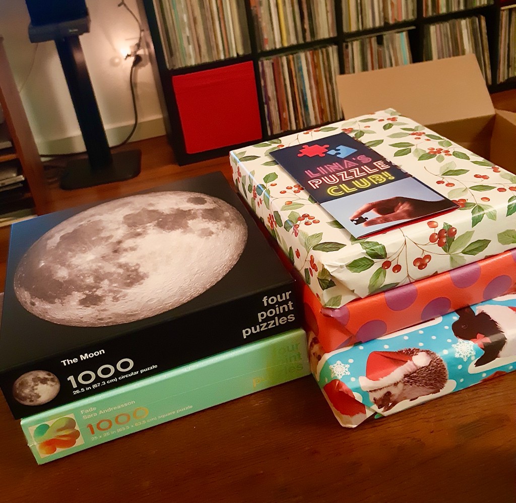 The rules are… that I can open a new puzz per month, as long as I’ve completed last month’s puzz and instagrammed about it. In the next photo you’ll see there are five boxes, I opened one by Four Point Puzzles of the Moon and then Joe said I could open another 🙂 Another Four Point Puzzles one that I’ve seen and always thought was so cool. I can’t wait to open the others when the time comes!