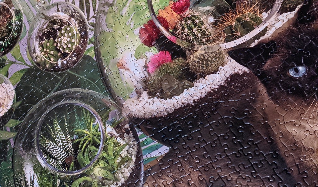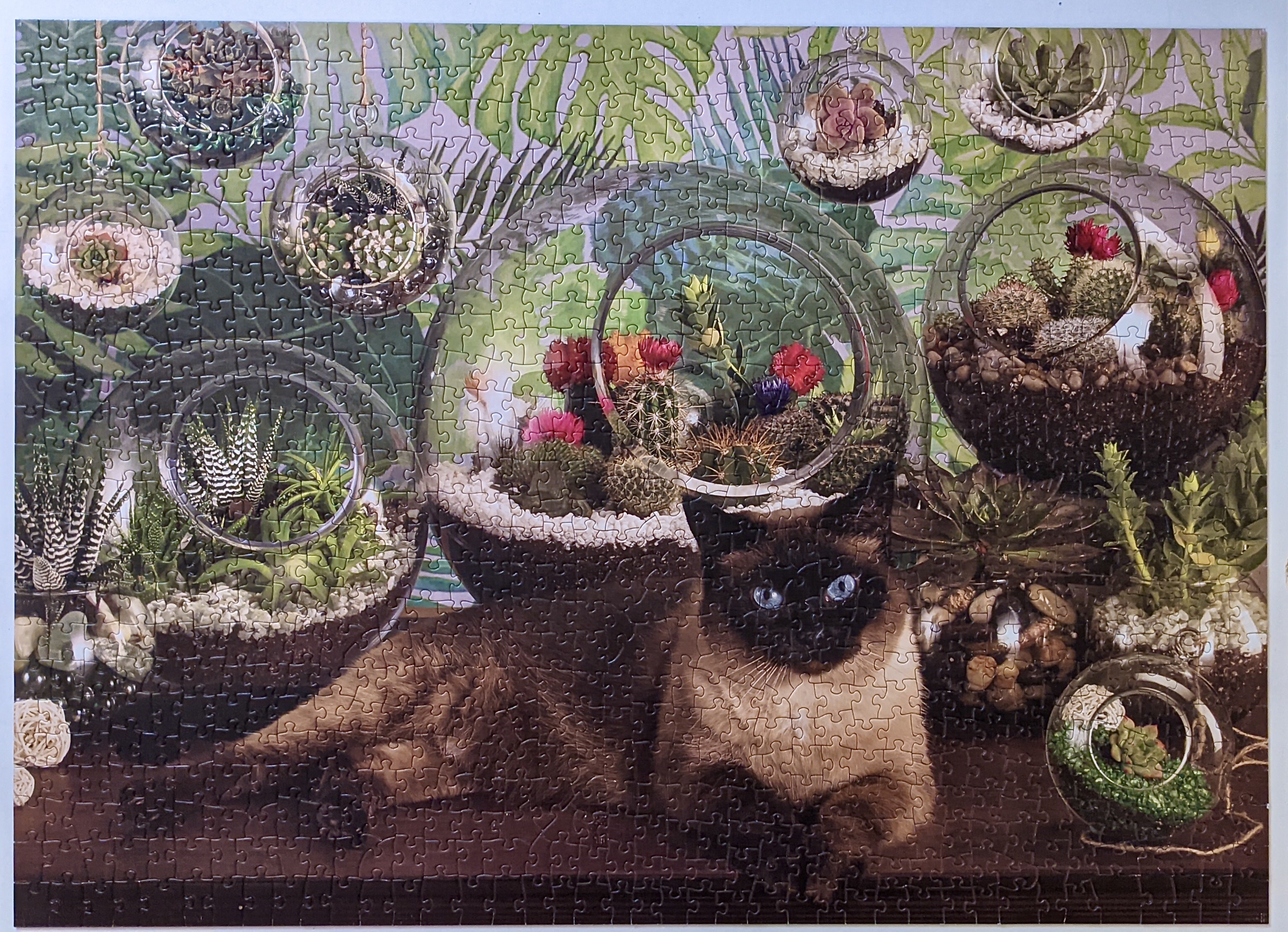 What a regal kitty! I found this puzzle on the two year anniversary of Chester’s passing. Even though this cat looks really different from Chester, I had to grab it. One thing I can say, is that Chester would never be so calm and composed around all these plants and glass terrariums!