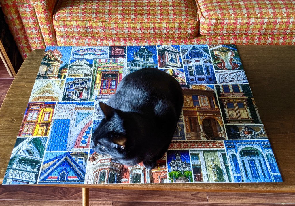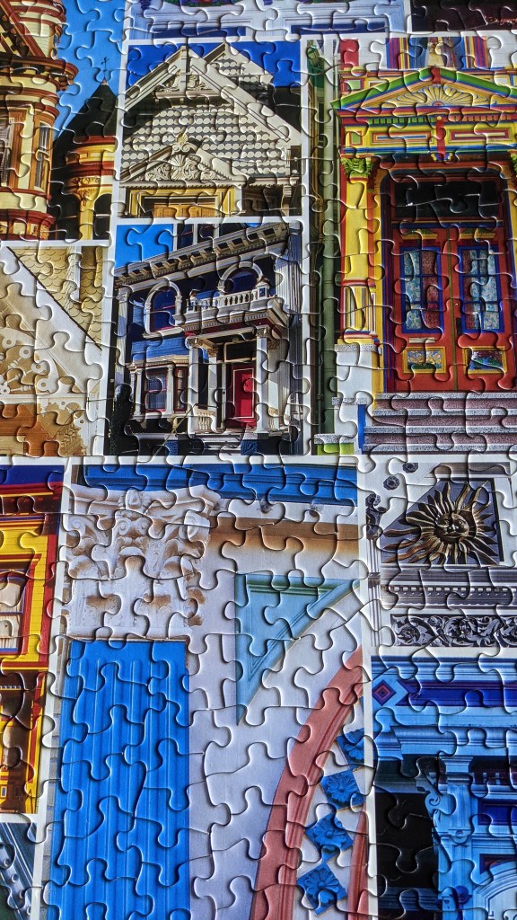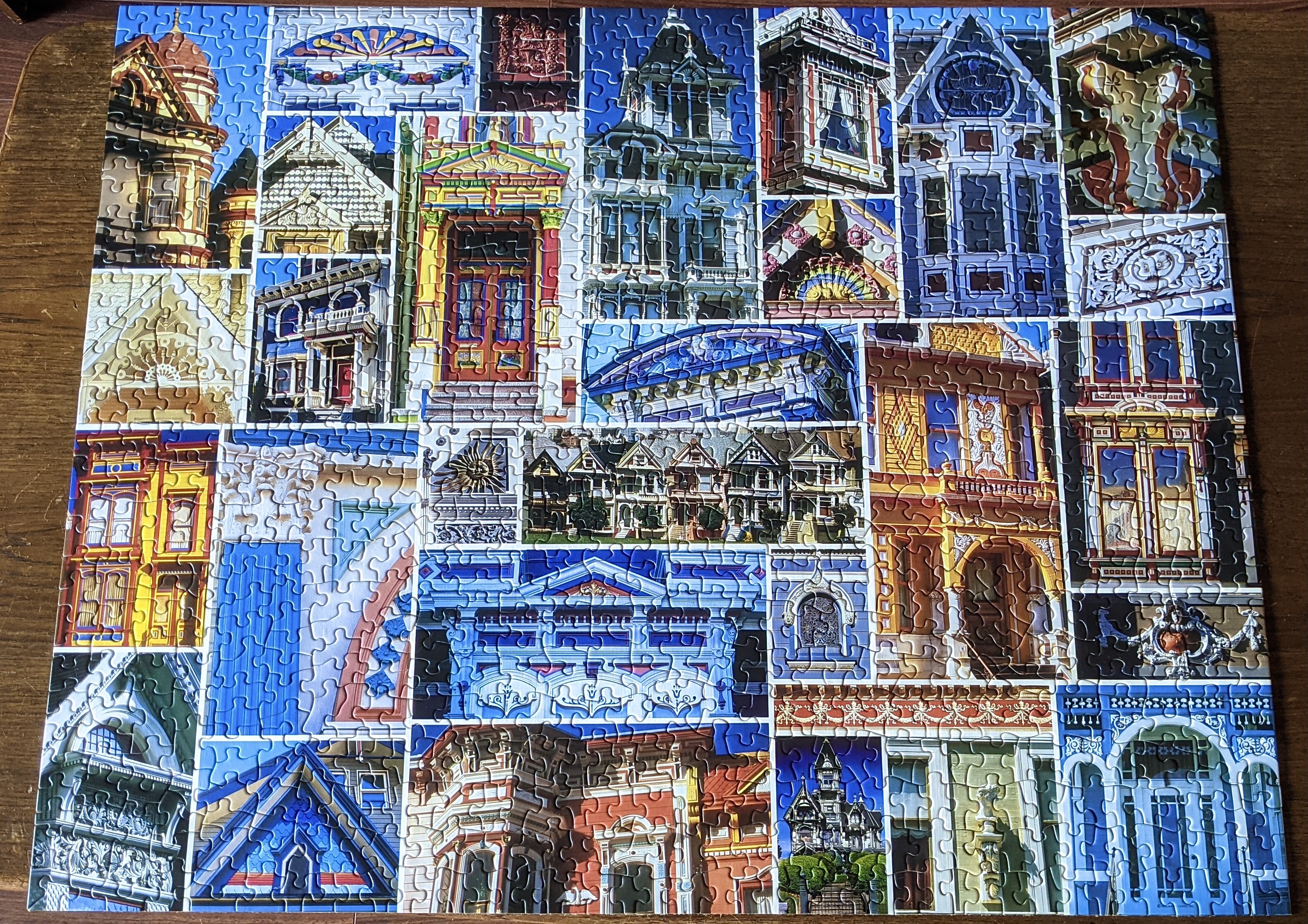 A 1000 piece Springbok puzzle depicting various highlights of lovely Victorian era homes. Missing just one tiny piece! I definitely love this era of architecture, so much detail and whimsy, when they are brightly coloured like these ones, they can be so stunning. (If a tad busy)