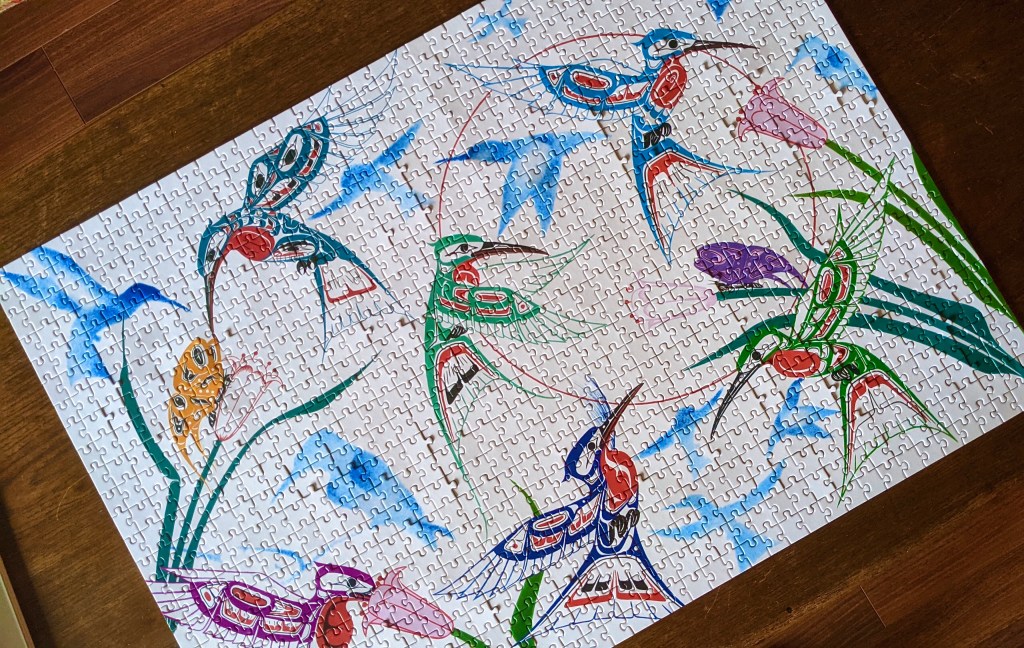 He eventually began exploring the Northwest Coast First Nations design and then developed his own distinct style marrying all his experience with painting over his life. I love this image of the hummingbirds, where some are in shadow and others are detailed and colourful!