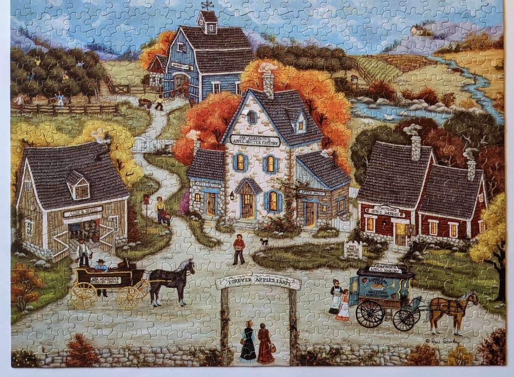My friend, Shelby, loaned this charming little puzzle to me. The artwork is by an artist named Ann Stookey. Her goal is to capture a joyful moment in time, a slower paced life allowing for a greater appreciation of the simple pleasure in life. I find it a little funny how I can get a bit nostalgic for these types of pictures. I start daydreaming about apple picking and making cider, but of course… let’s be real, that is HARD WORK!