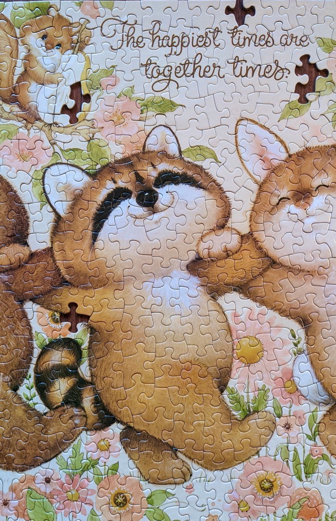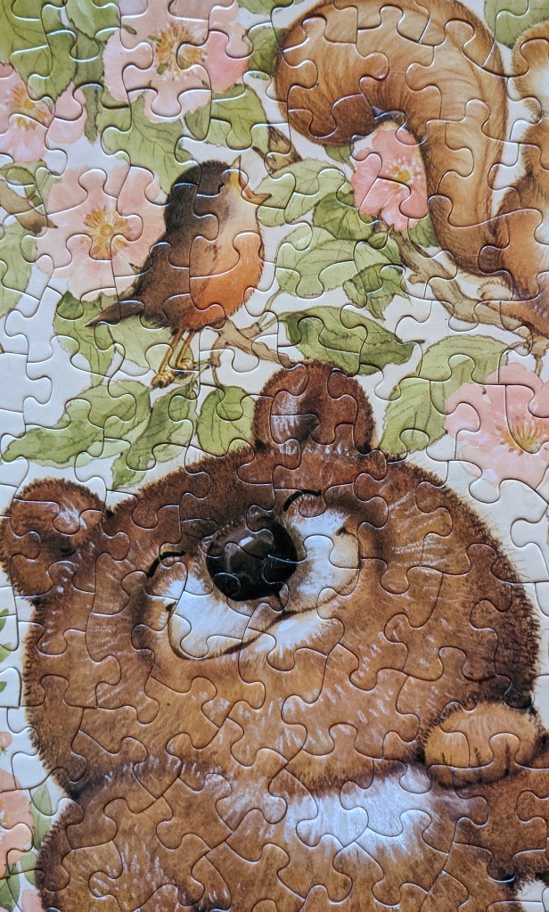 This bear’s smile is so cute but I especially love the birdie tweeting full force. When I brought this puzzle home from the thrift store, Joe laughed out loud!