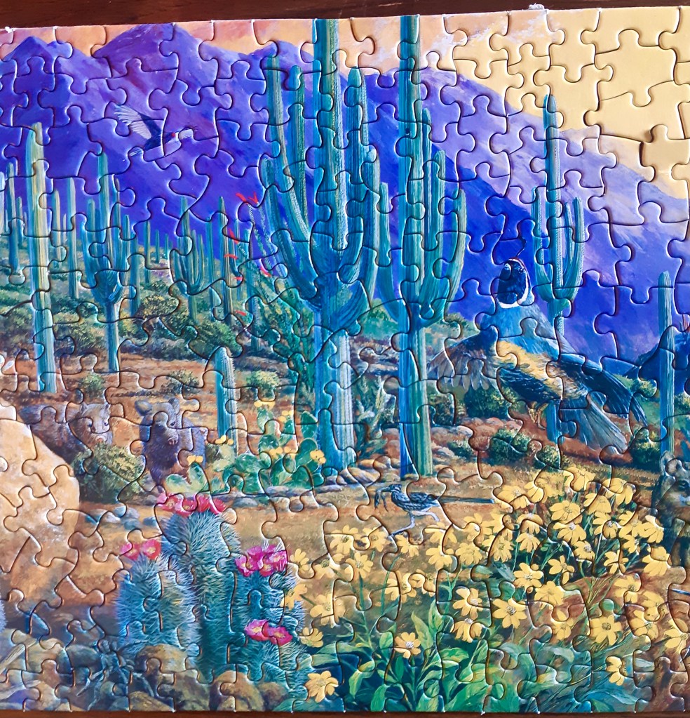 The pieces didn’t lock together at all and if you bumped the table a whole section would just disassemble all by itself! The only reason I followed through was the low piece count, the fact it was easy and because I loved the picture so much. It’s saving grace! The puzzle was complete and it’s going back to the thrift shop!