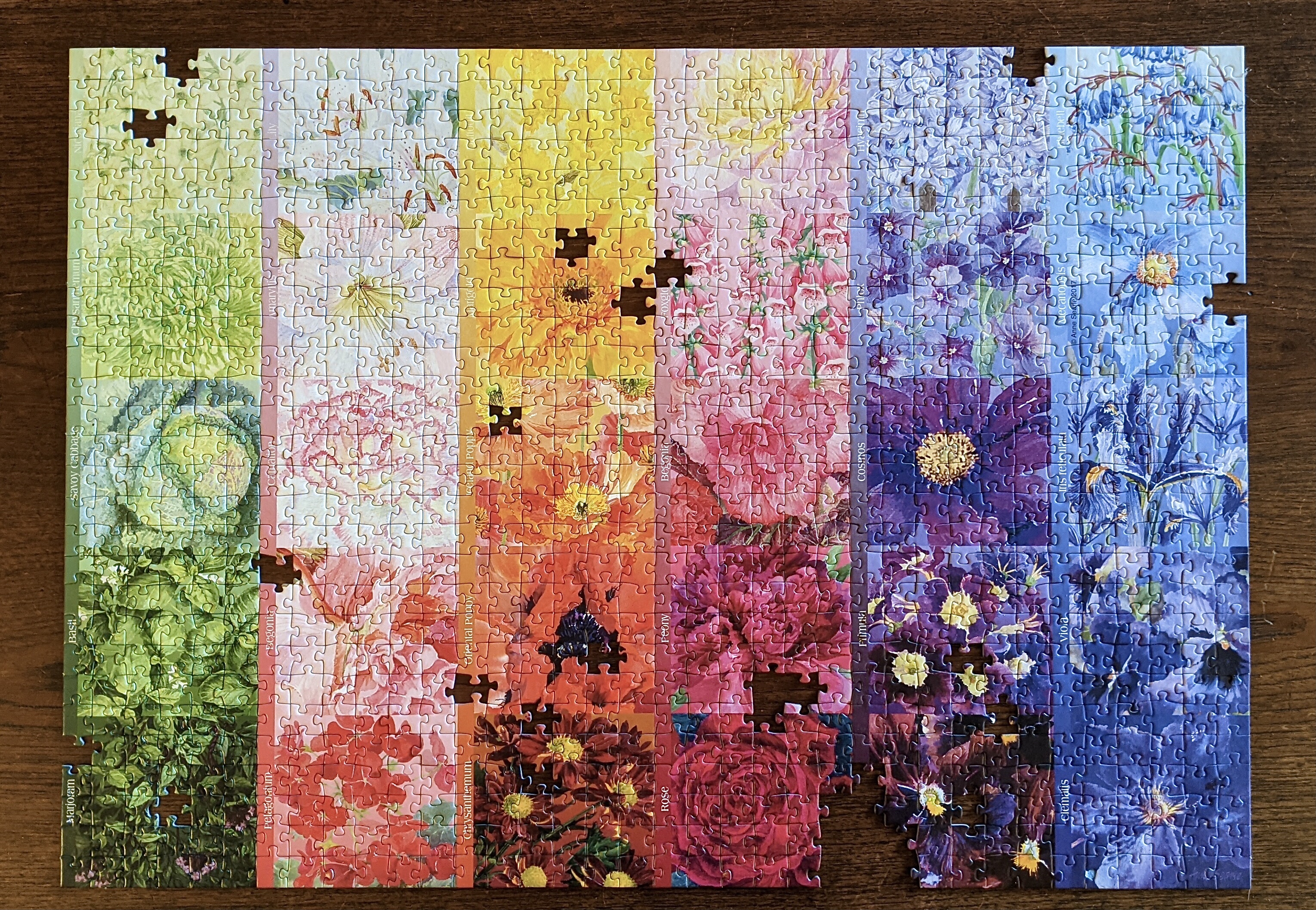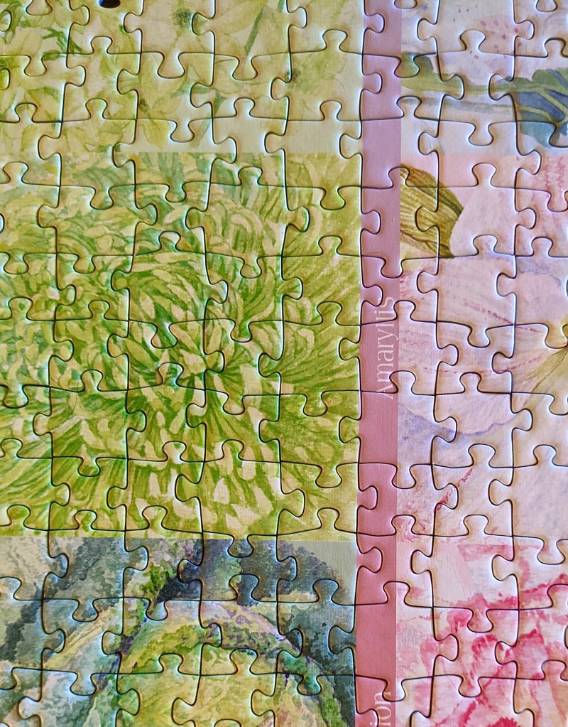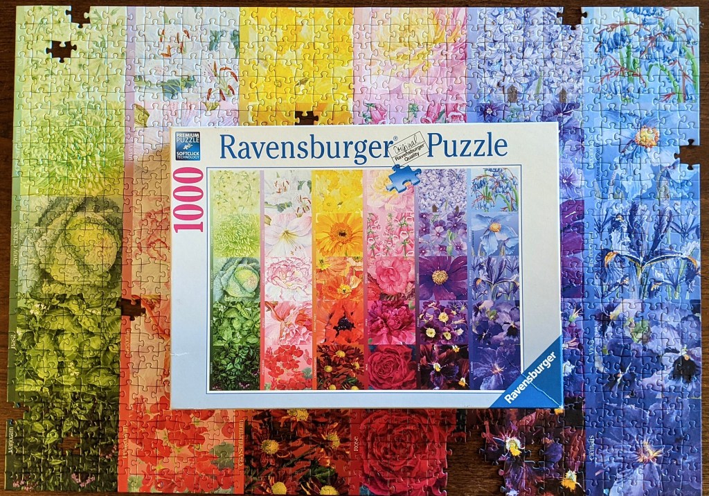 Oh well! I honestly didn’t care or mind at all! It simply ensures that I won’t want to keep it and create more puzzle clutter in our apartment. This was pretty fun to put together, I learned a bit more about flowers and puzzled block by block. It was fun trying to spot the difference between all the purple flowers, because they really looked the same to me.