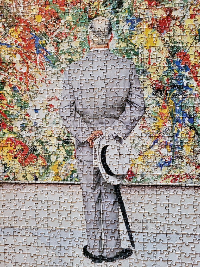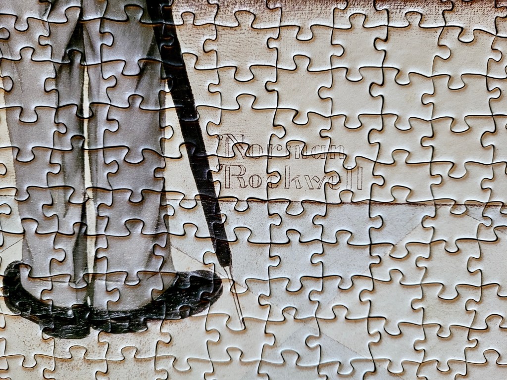 Apparently, Rockwell was a big admirer of Contemporary Art and in 1961, he set out to paint a Jackson Pollock inspired piece. As I was puzzling I did wonder what his method was for painting this, so I looked it up! Rockwell had some journals in his library, that provided him with information about Pollock’s process. Instead of painting the connoisseur and then surround him with the abstract image, he first painted the abstract as a separate and complete image. He then positioned a cutout of his painting of the man over his abstract to test the final effect. Later, he combined the images for his final painting. It appeared on the cover of the Saturday evening post in 1962.