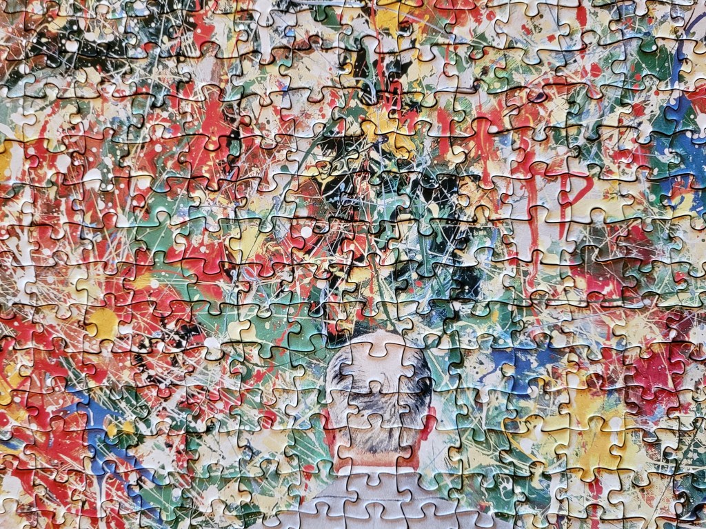 This was both an easy and challenging puzzle, the man and the surrounding area were pretty easy and that abstract painting was like my “Convergence” puzzle all over again! This was a complete puzzle, which I was very happy about, 1000 pieces, released by Pomegranate Artpiece Puzzles.