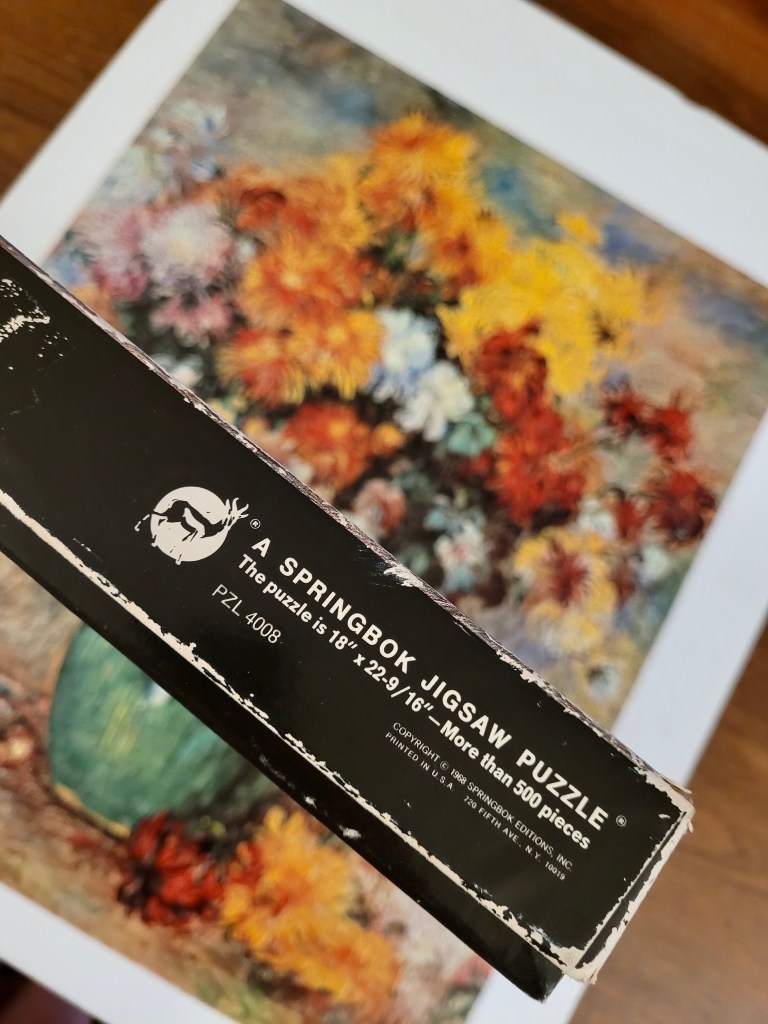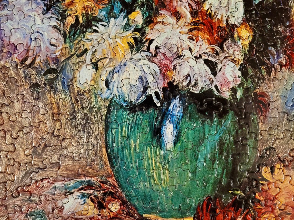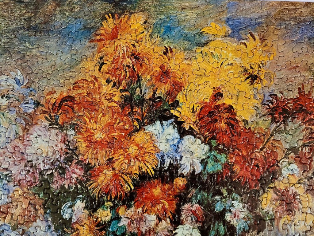 This is a stunning puzzle that dates to 1968 of An Auguste Renoir painting called Bouquet of Chrysanthemums. I thought it was going to be hard but this was perfect, a good challenge level but engaging and quick.