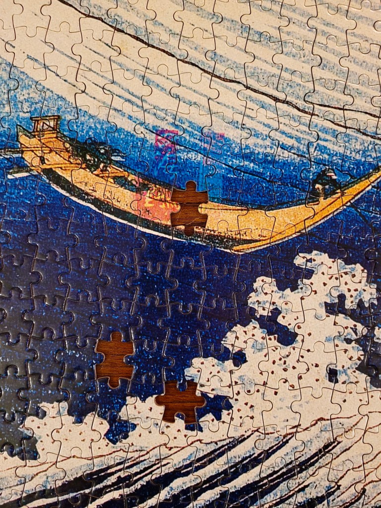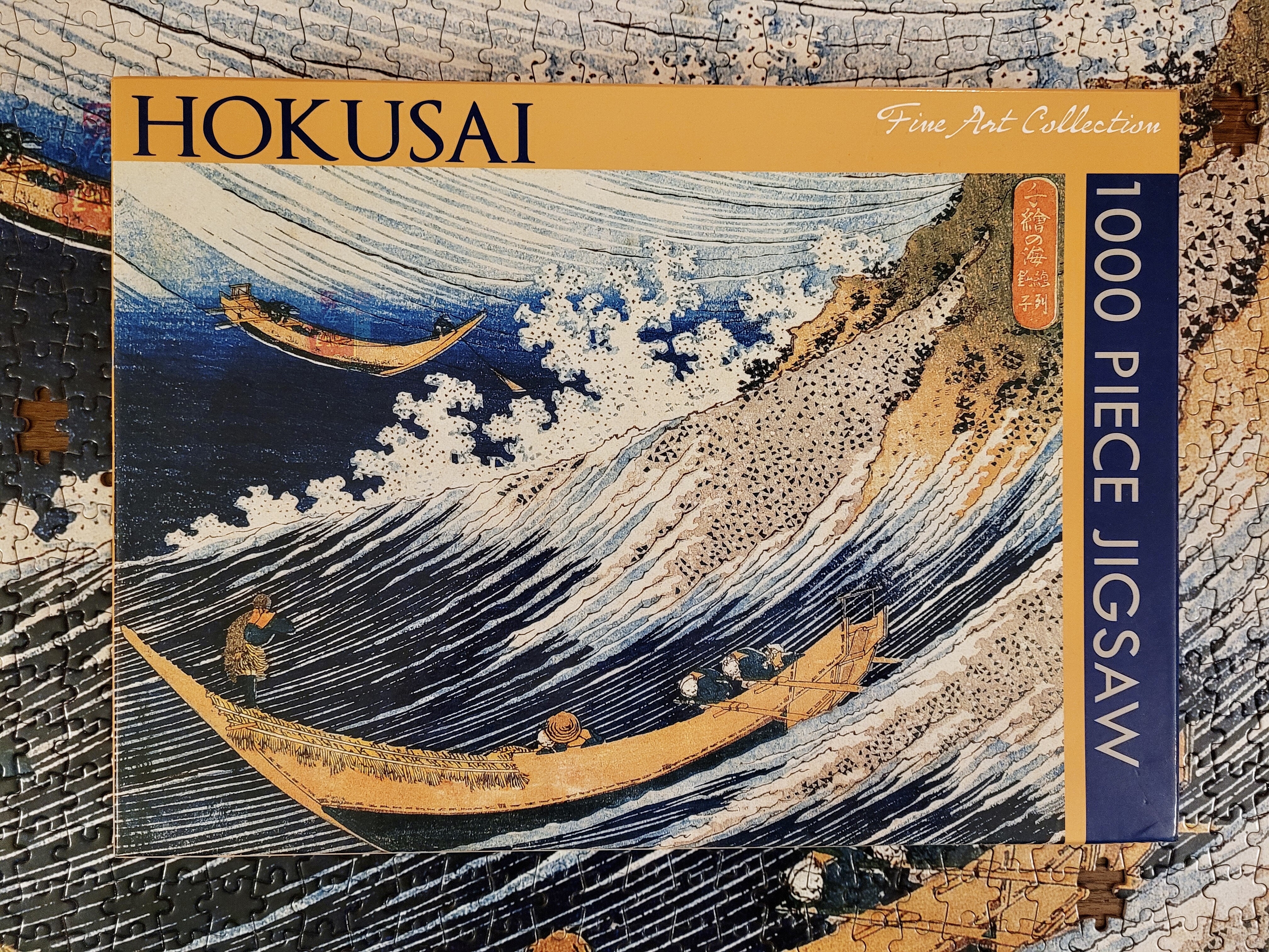 One day, Joe came home with a couple thrifted puzzles for me. One of which was this Hokusai puzzle of a print called Ocean Waves. There is a Homesense sticker on the back of the box, so this was recently purchased and then sent off to the thrift store, the manufacturer is the the Gifted Stationery Company.