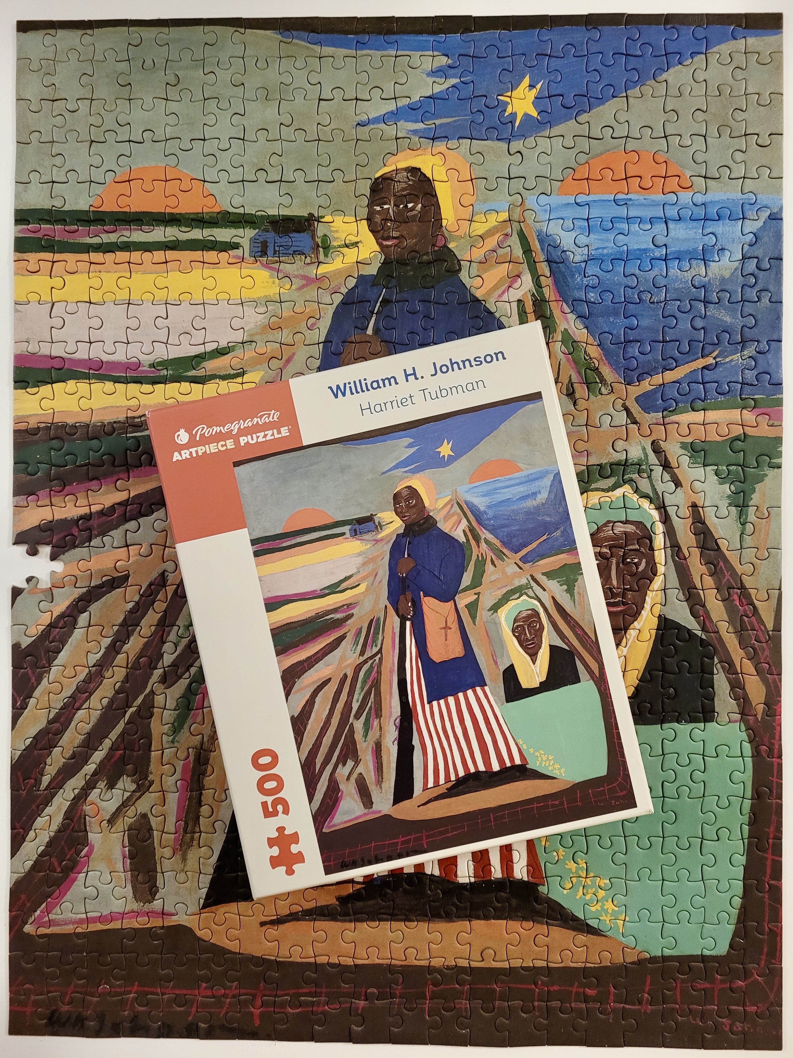 I picked this 500 piece Pomegranate puzzle up from the SPCA thrift store downtown a few months ago. I was really drawn to the use of colour in this portrait of abolitionist and political activist Harriet Tubman by American Painter William H. Johnson.