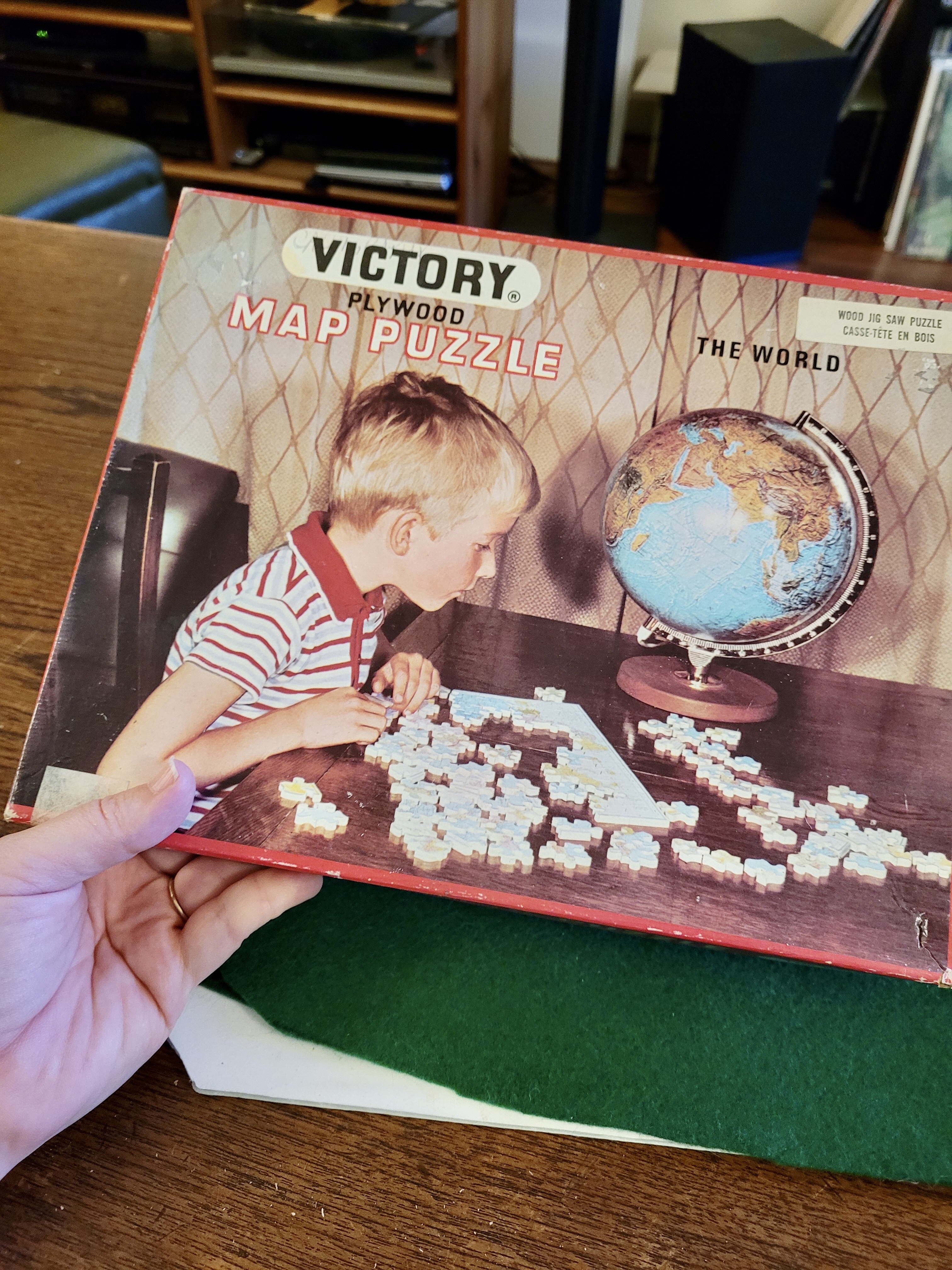 I hadn’t ever found a plywood puzzle before, it was lightweight, and the pieces had a satisfying clink when they tumbled out of the box. If I were to guess, this was maybe a 1960s or 70s puzzle? It still had the USSR, so definitely predates the 90s.