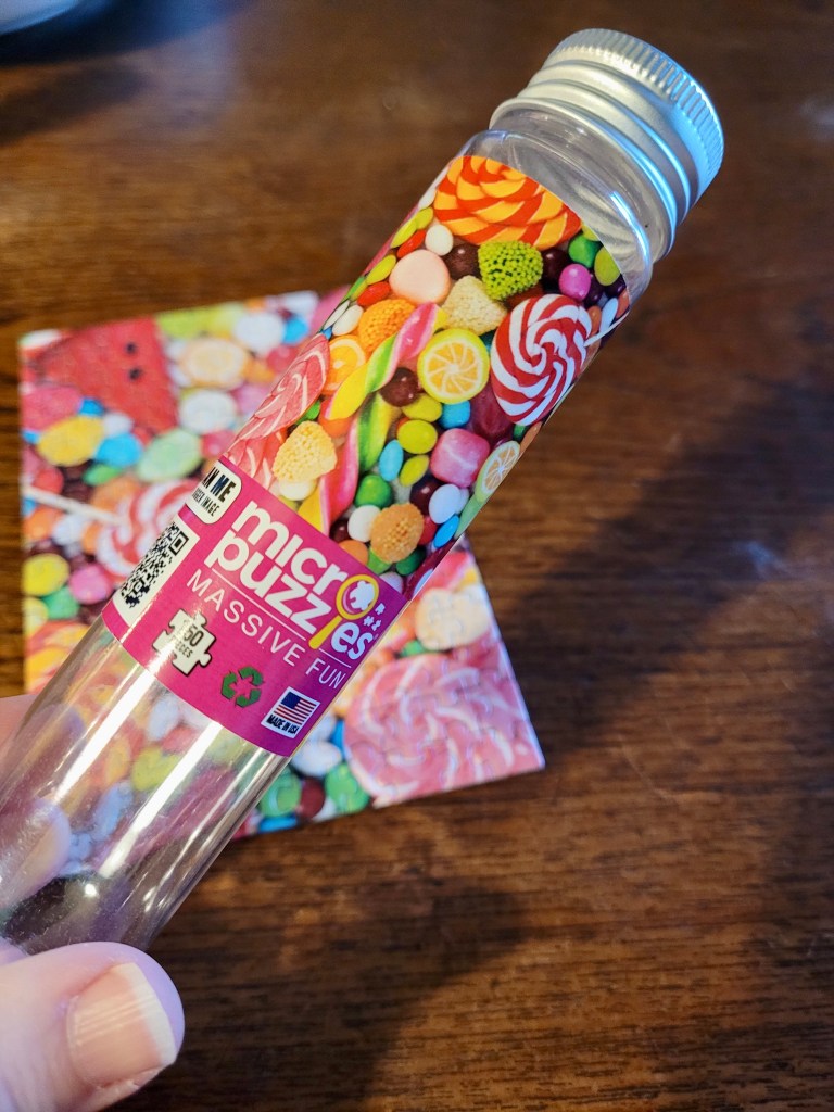 I had sent over some treats and she sent over many puzzle related goodies in return. See below for some puzzle themed socks, American m&ms and this candy puzzle that is the feature today π