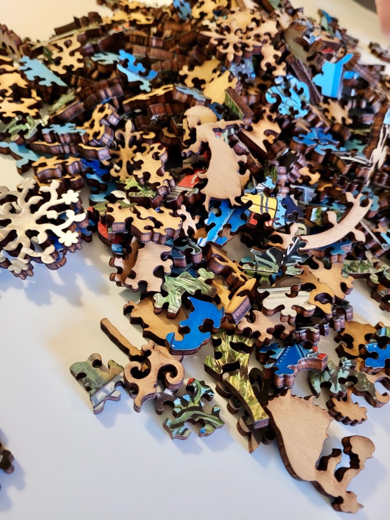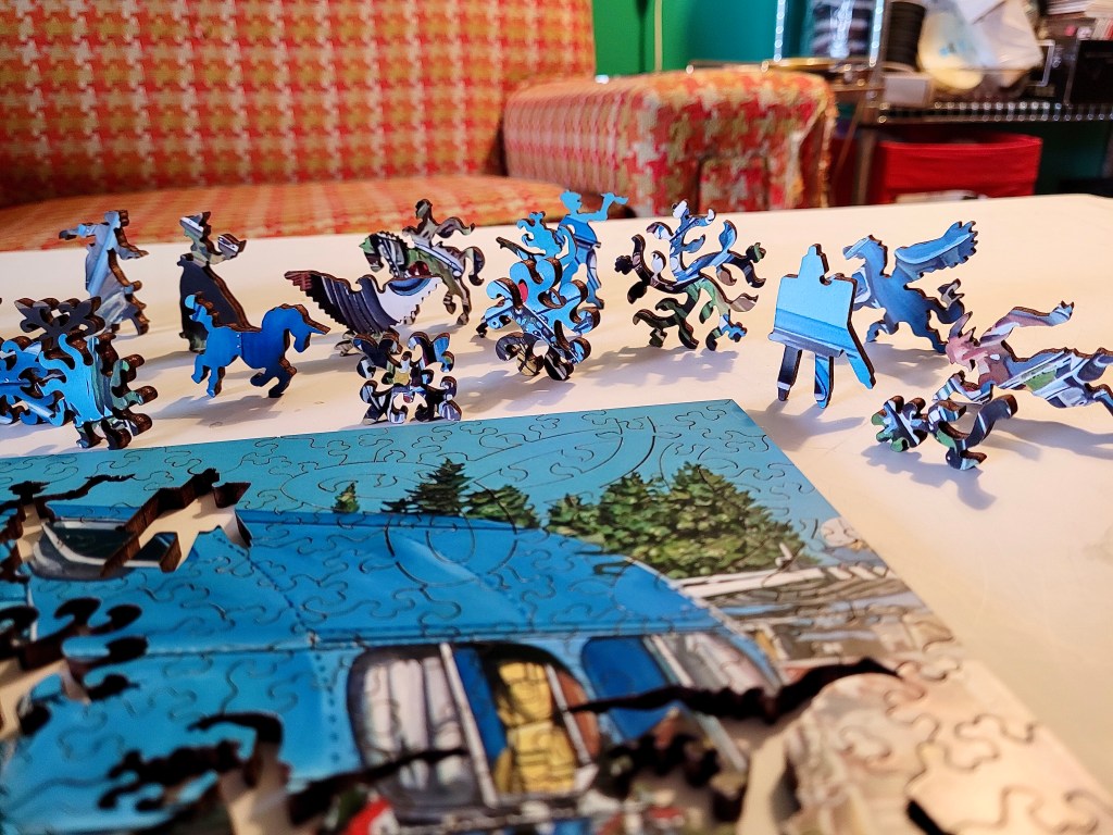 In that pile of pieces, you may see a couple people shaped pieces. A lot of wooden puzzles have what are dubbed “whimsy” pieces. But really I just call them special shaped pieces, this one had plenty!