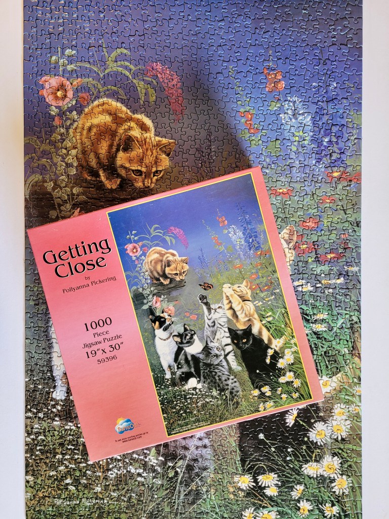 This lovely feline puzz was 1000 pieces by the brand Sunsout, which I’ve done before and quite enjoy (except for all the cardboard puzzle dust) and I’m happy to report that is complete!
