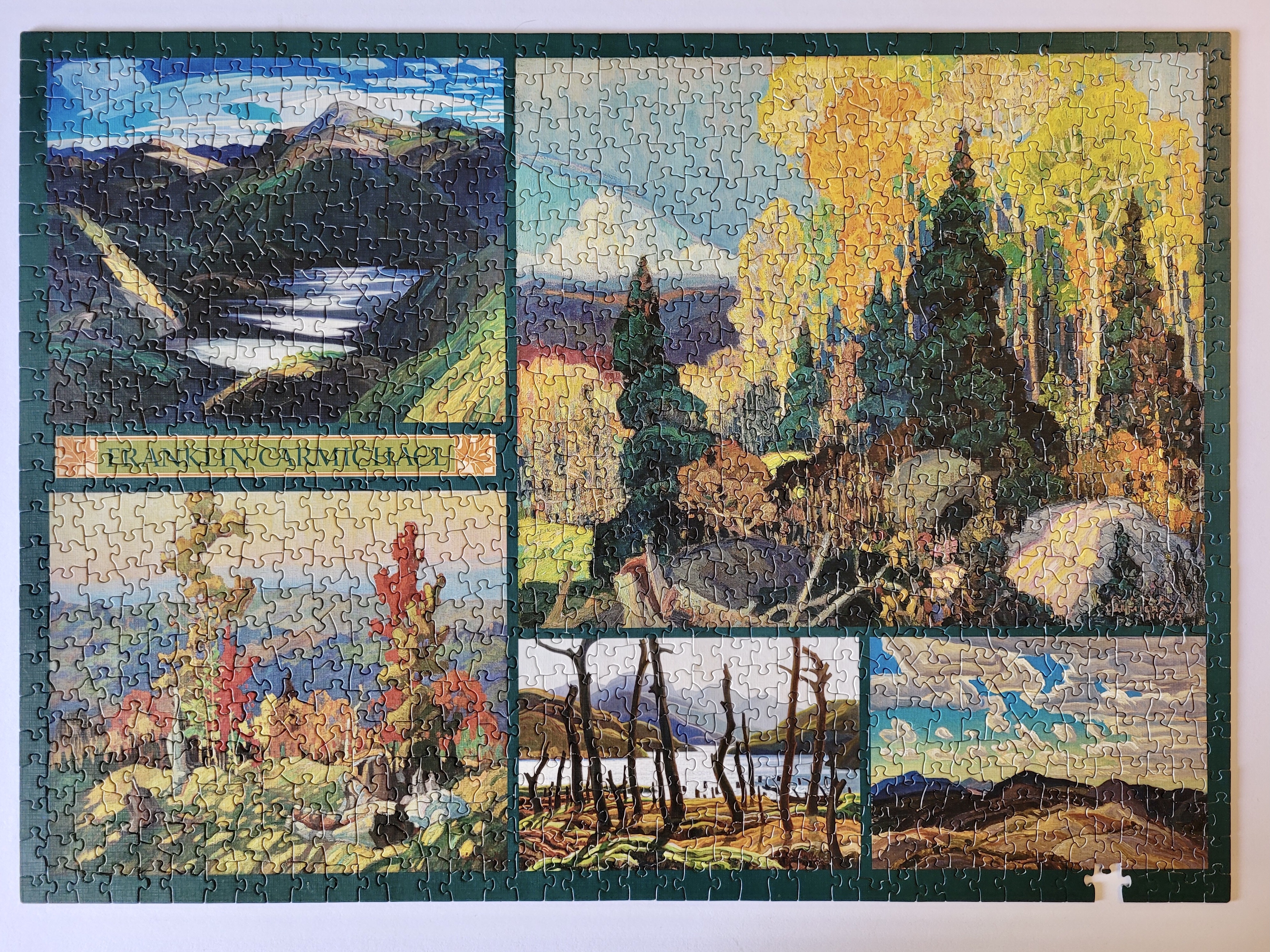 A few months ago, I completed a Cobble Hill puzzle featuring a few different paintings by Franklin Carmichael. You may remember that the puzzle was thrifted and missing one piece along the border.