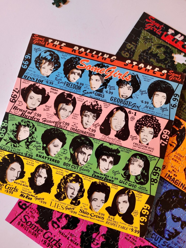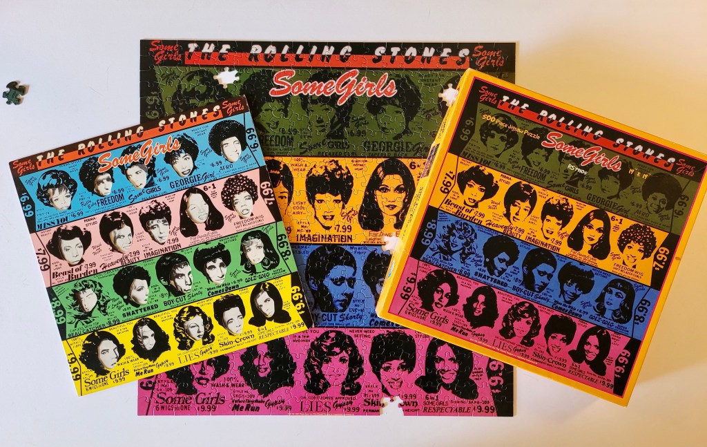 A puzzle by Suns Out from 1997, featuring the original album art from the Rolling Stones’ album called Some Girls. The title track has some not so good lyrics but we listened to the record when we put this puzzle together and there are some pretty good songs on this one.