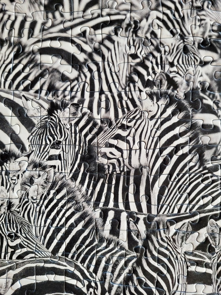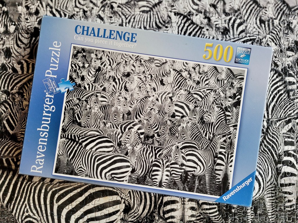 It was hard, that’s for sure! It wasn’t as hard as this one! Thankfully it was only 500 pieces, if it were more, I would have left it on the shelf. This was obviously had because of all the zebras and the black and white, but the image goes blurry up at the top of the puzzle, which interestingly, was a bit of an aid. It was surprisingly helpful!