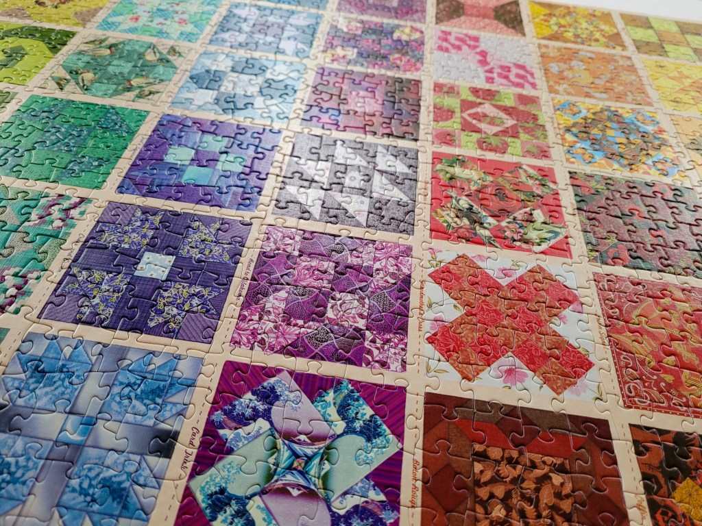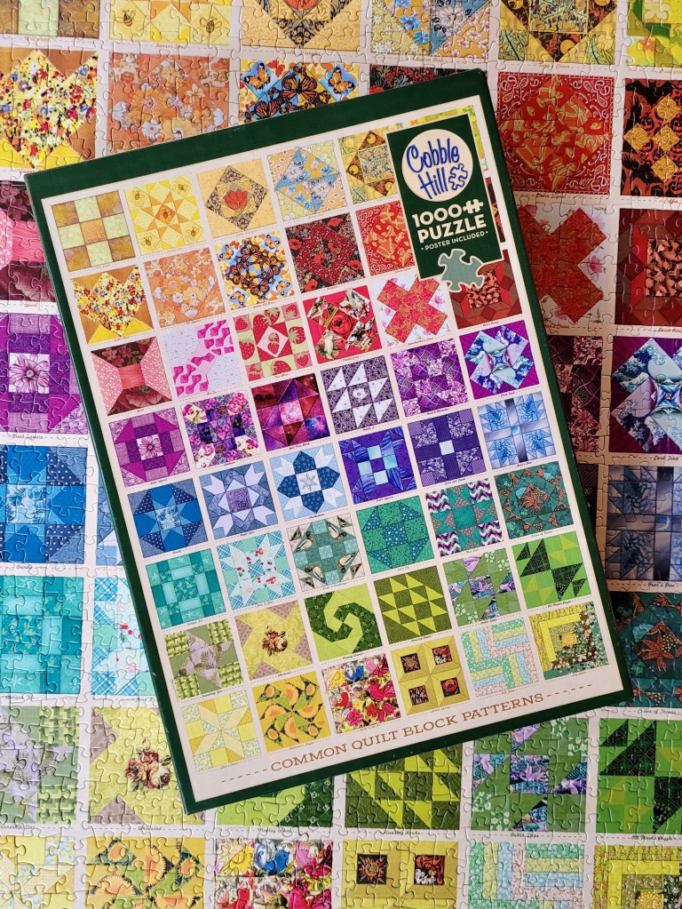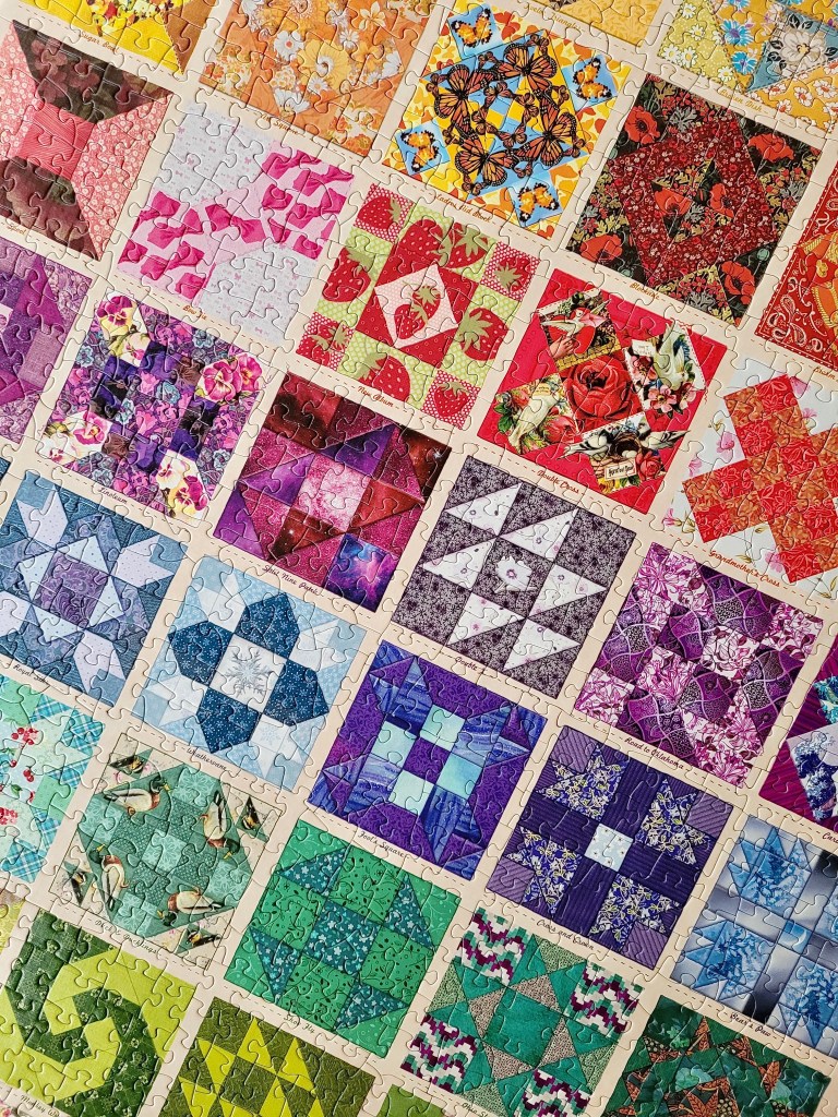 I think everyone who reads this blog or knows me, knows how much I love textile art. Quilting is such a classic form of textile art! This lovely puzzle checked all the boxes, fun fabric prints, rainbow order, and a grid layout.