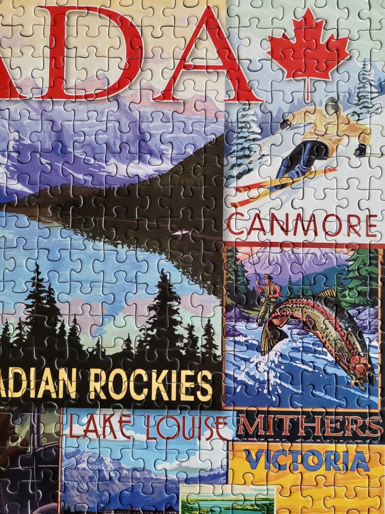 This puzzle reminds me a lot of that wonderful series by Andrew’s Blaine and Lantern Press, the vintage Canada poster puzzles. I found this at a thrift store in Dartmouth, recently, and even though I don’t always love this brand, I gave it a chance.