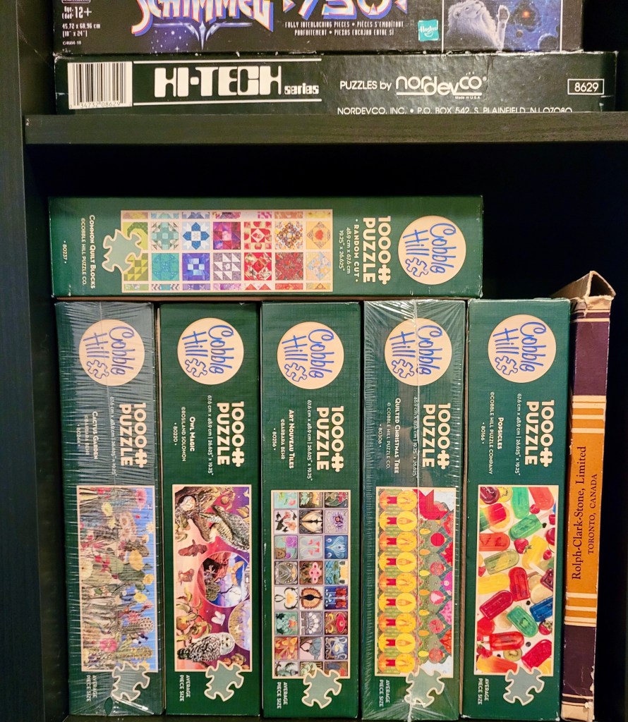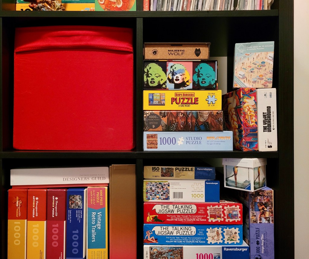 I never had a puzzle shelf, I used to store my puzzles on top of my kitchen cupboards. It started as a way to keep my cat Chester from climbing on top of the cupboards and it turned into “the place for puzzles” in my last three apartments.