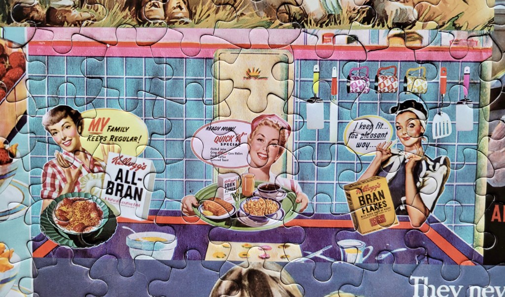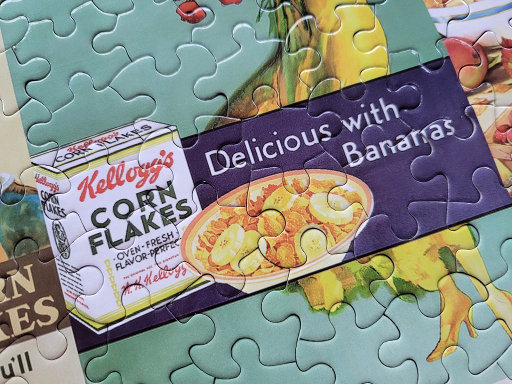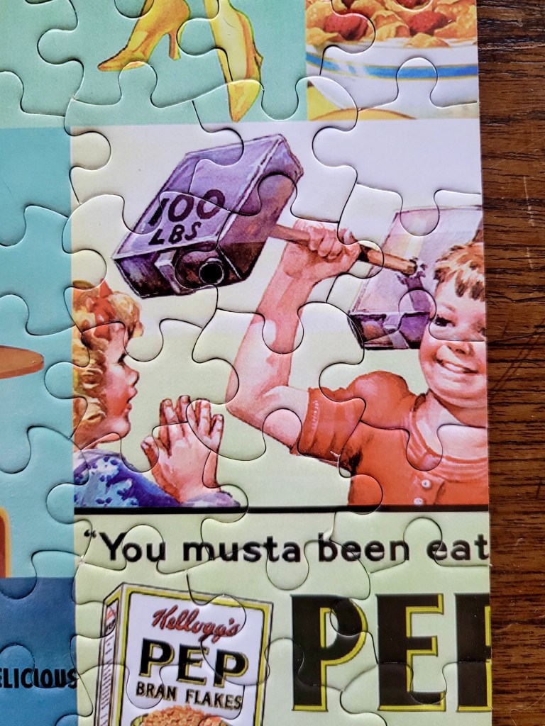 I love all the angles used in this collection of vintage graphics, delicious with bananas, a cool meal in the hot summer, your boys will grow into strong men, they really went for it all. This puzzle had me thinking about what ads I grew up with. Tony the Tiger bobsledding during the Winter Olympics, that was a memorable one for me.