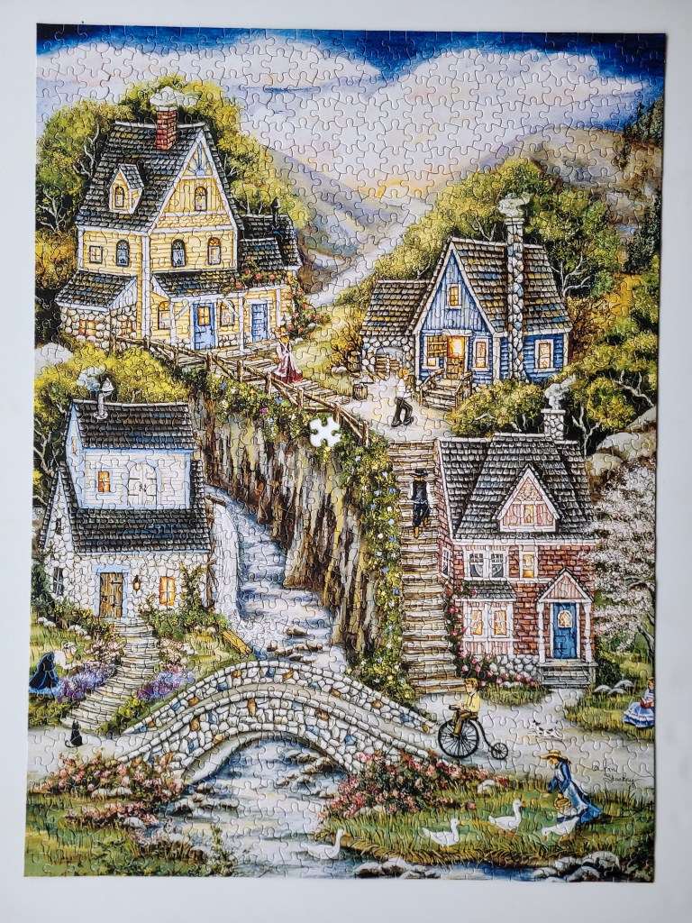 That was painted by an artist named Ann Stookey, and so is this one! Another wholesome, nostalgic depiction of a simpler time. Pretty houses tucked away in nature, people busy with their everyday chores.