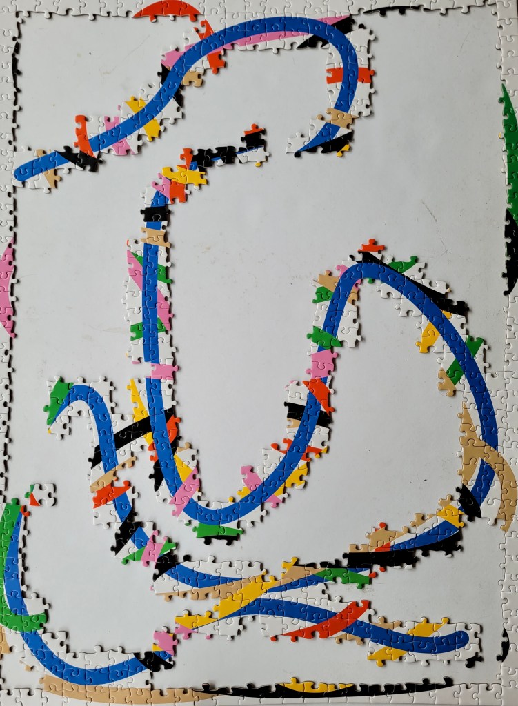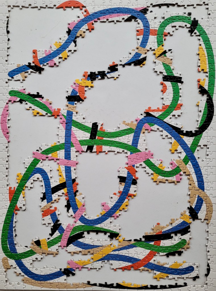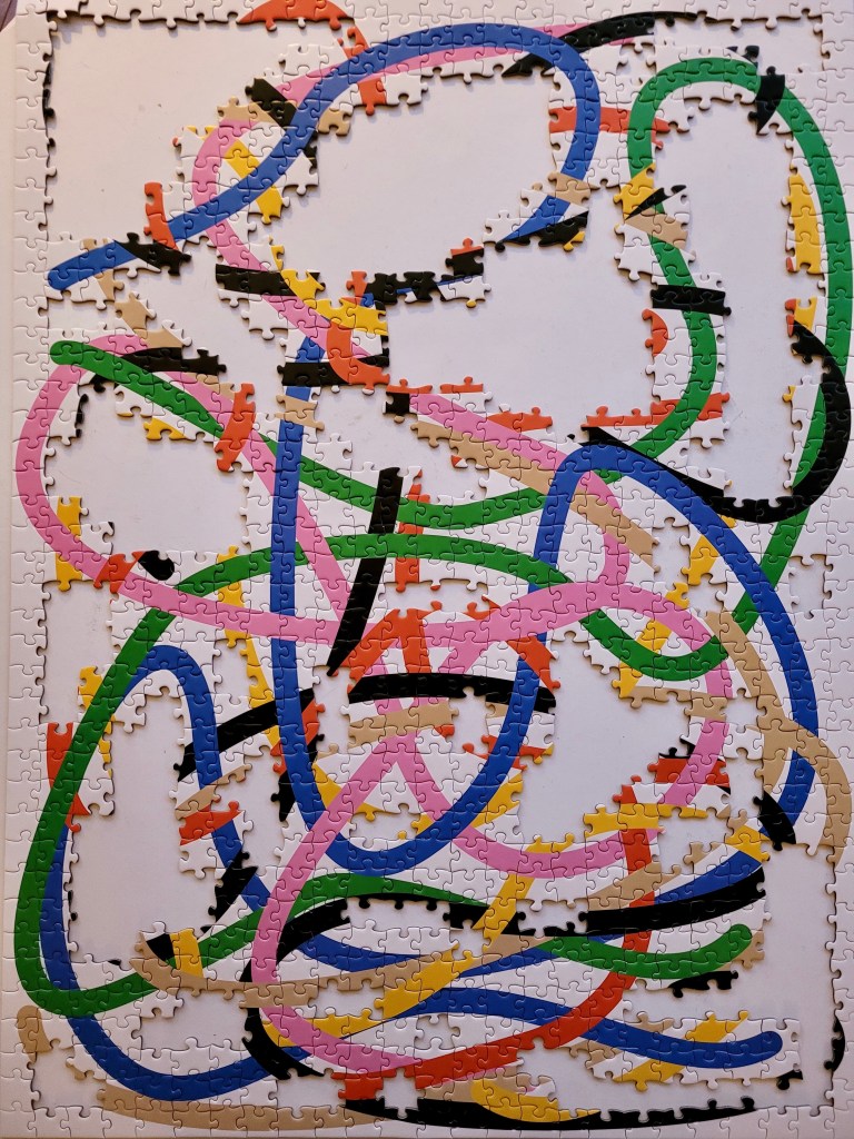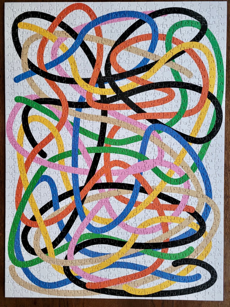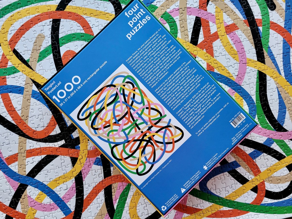 I wanted bright colours and a moderate difficulty level for my next puzzle, and Tangled by Four Point Puzzles was the perfect fit! I mentioned my post, New York Quilt, that Four Point recently had a closing out sale. This here puzz was the second out of three that I picked out.