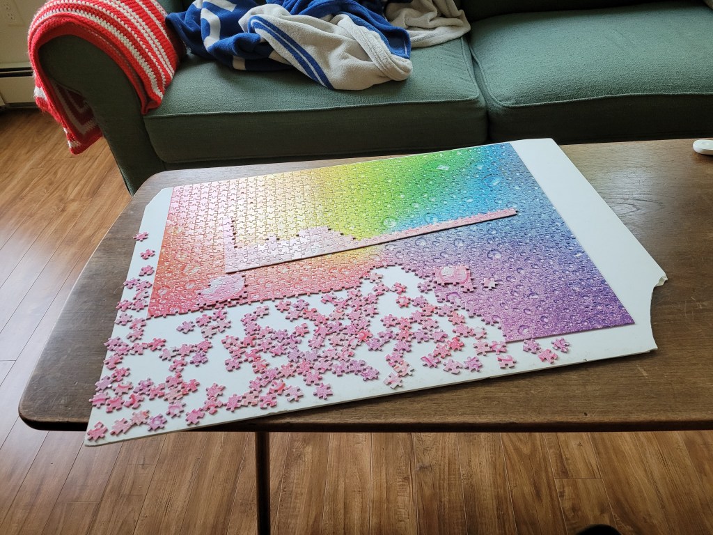 Well, I found a few puzzles recently that I never really expected I’d find at the thrift stores. I found a Josie Lewis Art rainbow puzzle – Josie Lewis is a big time favourite amongst many puzzlers. I’m sure I’ll be assembling that one soon enough, it looks so fun!