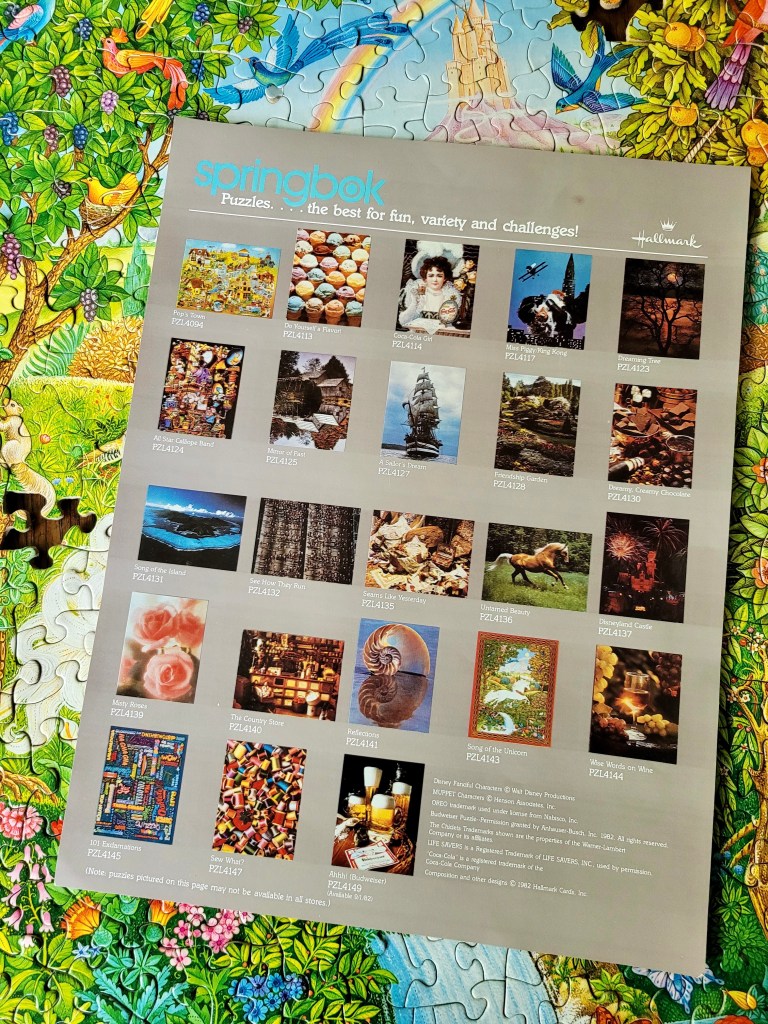 One treat in this puzzle was all of this original proof of purchase and the sheet catalogues from 1982. I love these so much, I identify the puzzles that I’ve completed before and of course, the ones I’d love to find on a future thrift hunt!