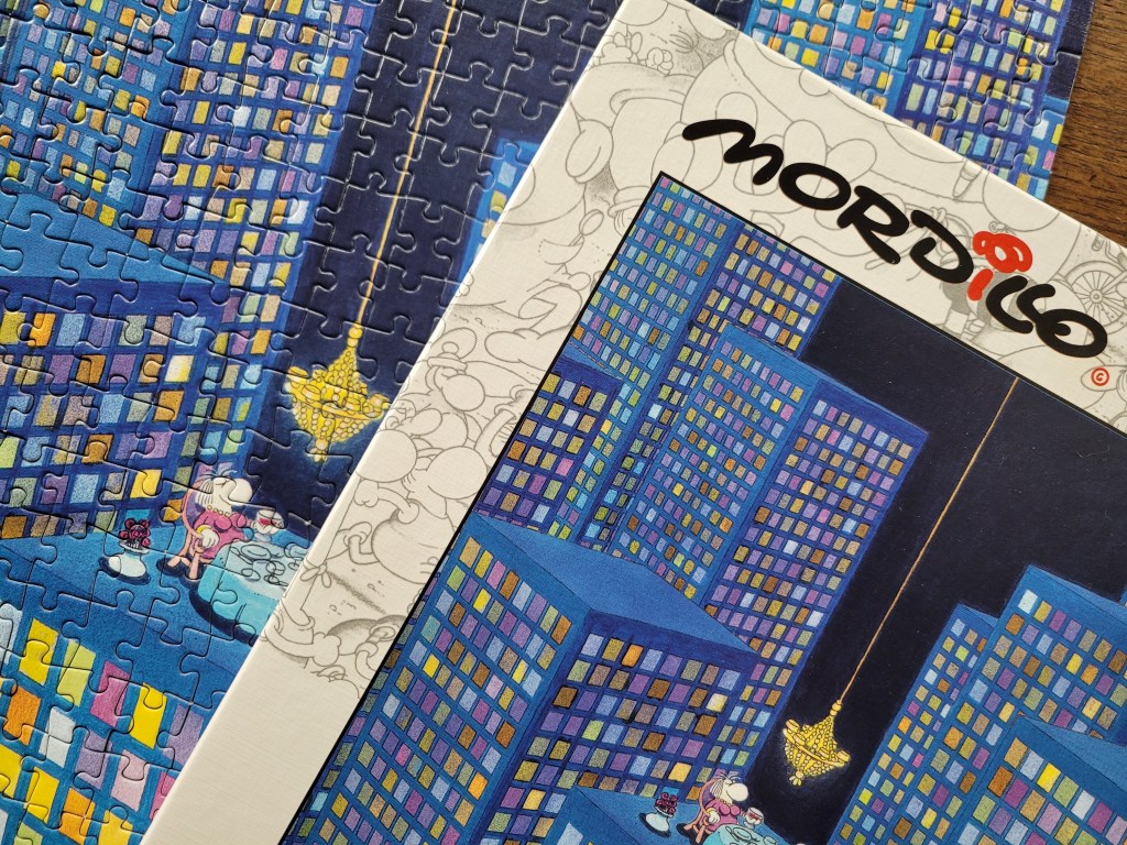 Guillermo Mordillo is a very popular choice for puzzle pictures, especially European brands like Heye and Clementoni. This puzzle is actually made by Clementoni puzzles. Mordillo was well know for his cartoon characters that have big noses and are simple line drawings.