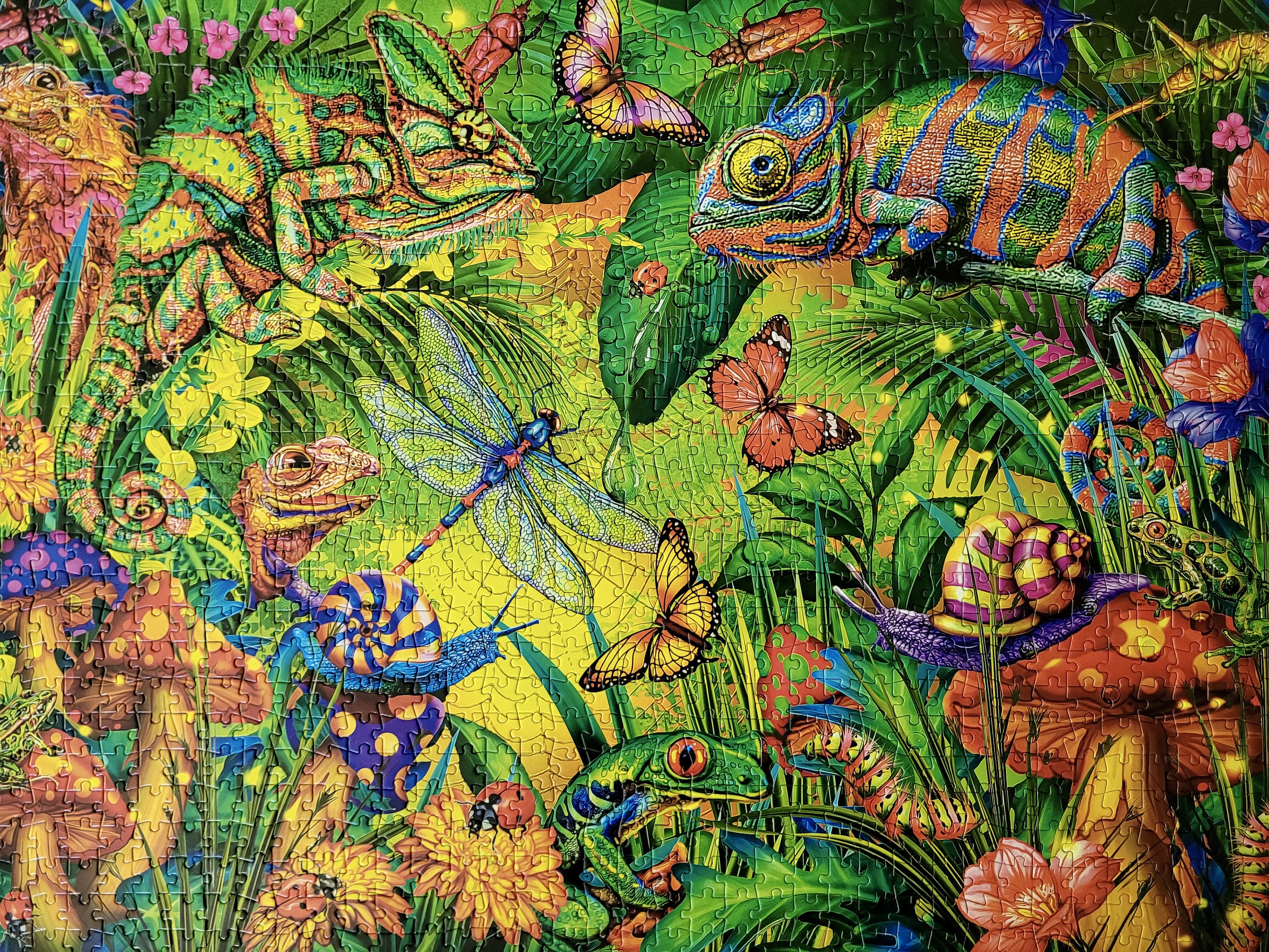 This puzzle has so many of my favourites in it! Chameleons, frogs, green lush plants, snails, mushrooms, fuzzy caterpillars, butterflies, it’s all so good.