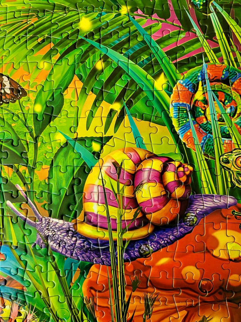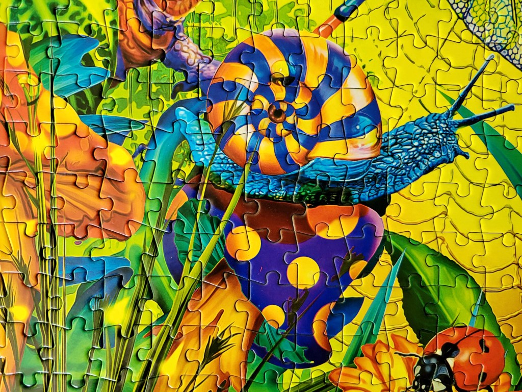 There’s a quality to this puzzle that made me think of Alice in wonderland, the mushrooms, I’m guessing. But I must say that I especially enjoyed the bright blue and purple snails!