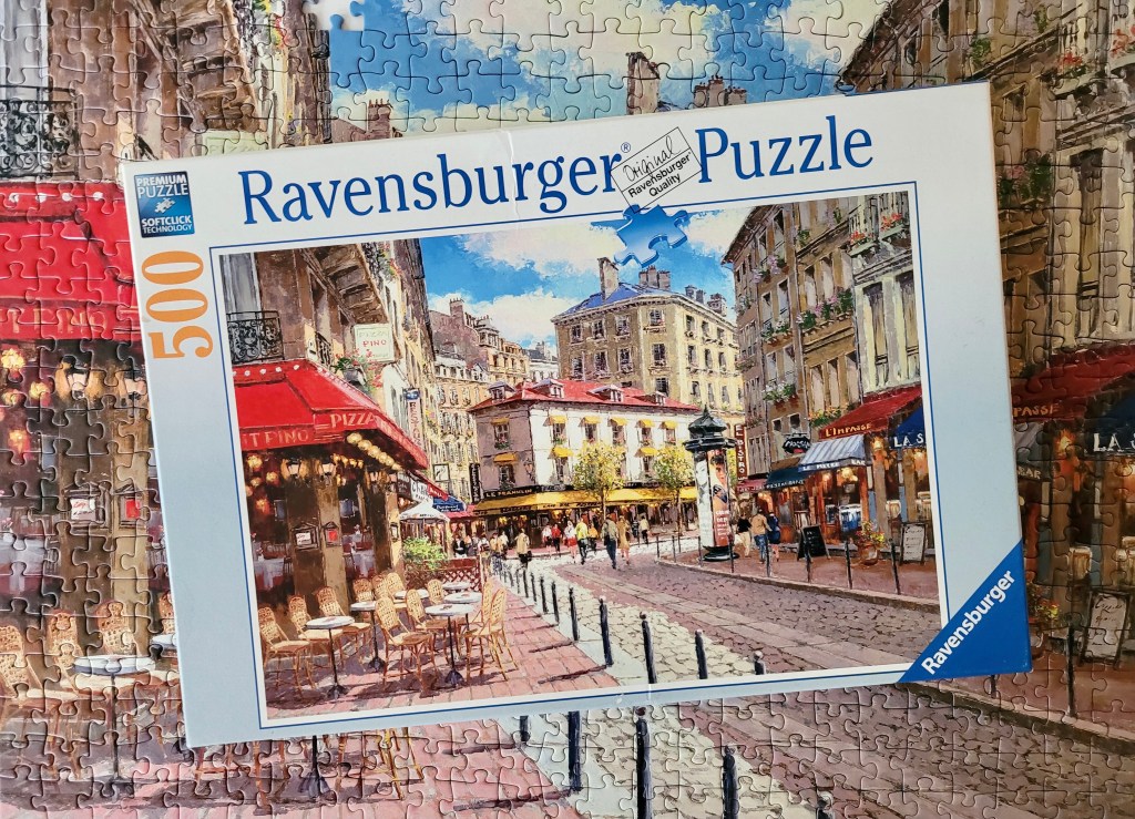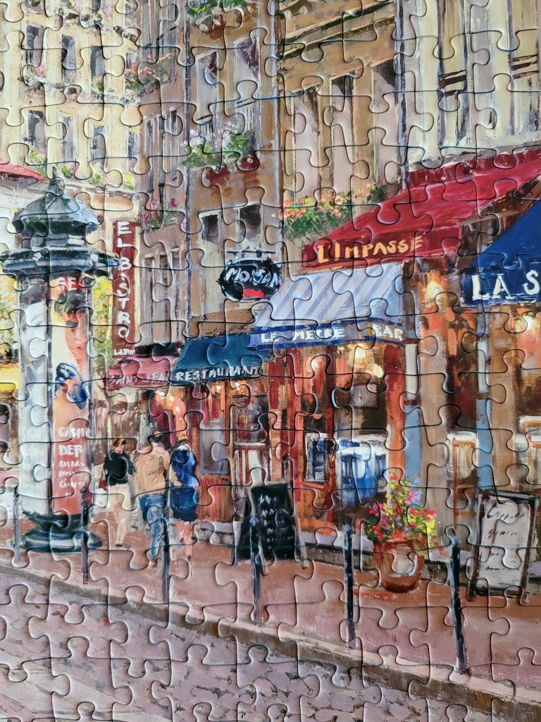Yes, it was missing 2 pieces in the top left part of the puzzle. Missing pieces aside, I really enjoyed this little puzz. It reminded me of my first visit to Paris (which, controversial opinion here… I am not as in love with Paris as many people are) but I did really love the buildings that I’m going to guess were apartments above and shops below. They were very pretty and felt so quintessentially Parisian! So this puzzle brought up memories of a fun trip with friends!