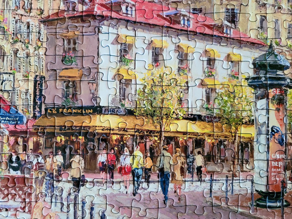 I was so struck by how abstract the painting looked up close, but with perspective you noticed people walking, shop signs, all those little details were so fun to explore in puzzle form!