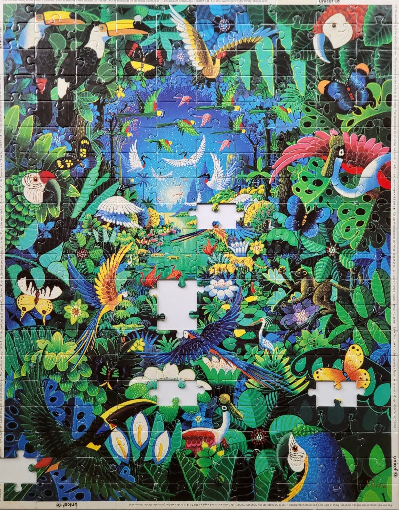 I have never seen so many UNICEF brand puzzles at the thrift stores as I have since moving to Nova Scotia. They must not have been very popular in BC, and very popular over here. This particular scene really appealed to me, surprise surprise!