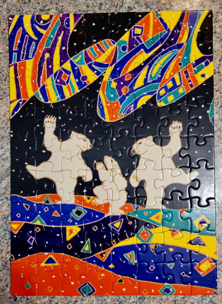 I have always wondered about the quality of the mini Indigenous Art Puzzles by CAP. I must confess that I don’t love the quality of the full size puzzles by them, they don’t really lay flat and the pieces are not all that unique, so you end up with a lot of misfits. I was pretty bummed about that, because I love the art work and learning more about indigenous artists.