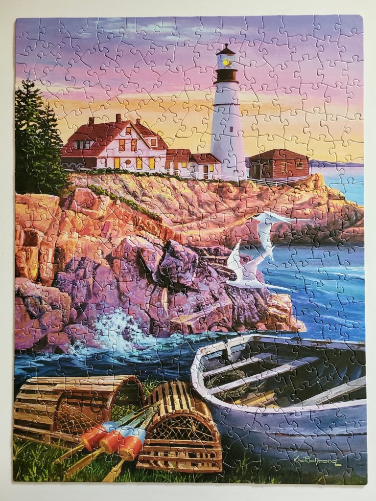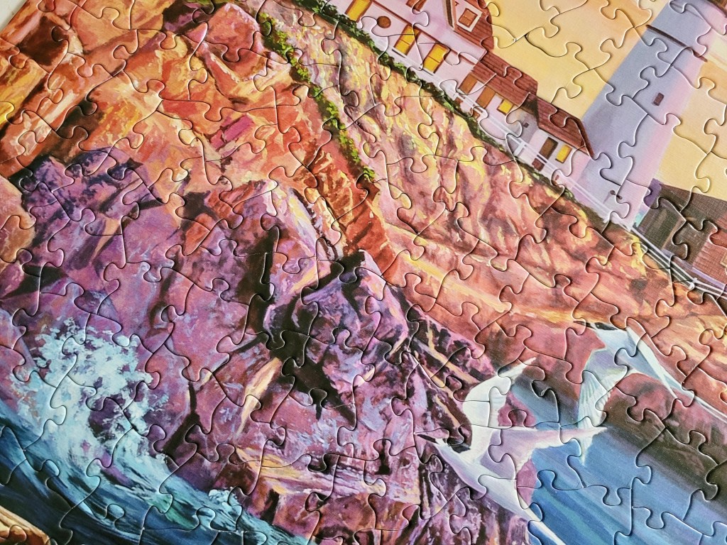 There’s no artist credit on the box, it just says Cobble Hill Puzzle Co. So it must have been designed by their in house team of artists. You may think the scene a bit cliche, but I have to say, this is pretty spot on with some of these gorgeous East Coast lighthouse coves. You’ll see lobster traps piled up, and little fishing boats, just throw in a stunning sunset, and you’re spot on!